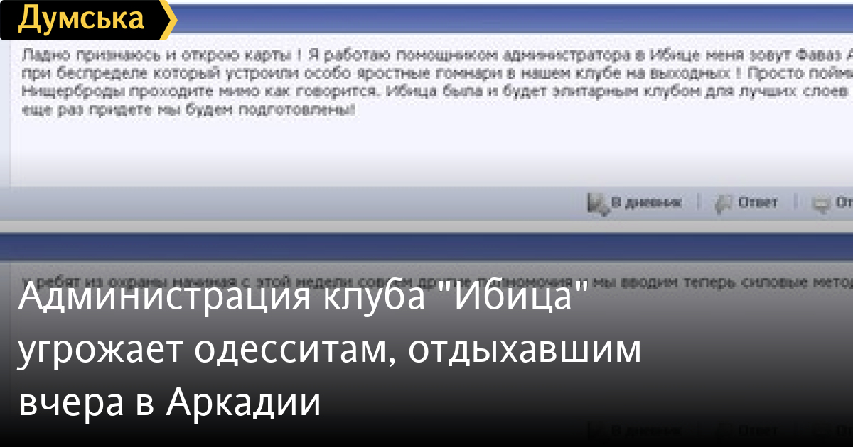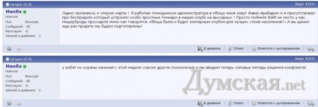 В дальнейшем Menfis написал, что его зовут Фараз Арабаджи, что он помощник администратора «Ибицы» и присутствовал во время попыток сотрудников клуба выгнать одесситов: «Я присутствовал при беспределе который устроили особо яростные гомнари в нашем клубе на выходных! Просто поймите ВАМ не место у нас. Нищерброды проходите мимо как говорится. Ибица была и будет элитарным клубом для высших слоев населения. А вы щенки еще раз придете мы будем подготовлены!» [орфография сохранена — ред.]
