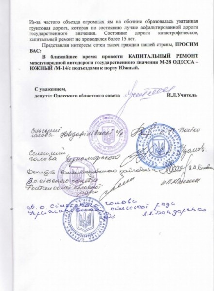 Во время встречи было подписано общее обращение на имя начальника службы автомобильных дорог Одесской области Батурина Виталия Николаевича. В обращении изложена вся суть проблемы, а также требования провести капитальный ремонт международной автодороги государственного значения М-28 «Одесса-Южный».