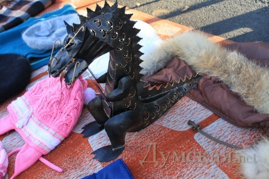 Настоящий «раритет» был найден в одном из переулков на «барахолке», примыкающей к рынку. С виду, обычный металлический подарочный дракоша на самом деле оказался… подсвечником. В брюшке у сказочной рептилии есть дверца, куда можно поставить небольшую свечку. Предполагается, что из пасти будет идти дымок. Сколько стоит такая красота, узнать не удалось – хозяина дракона на рабочем месте не оказалось.