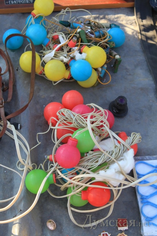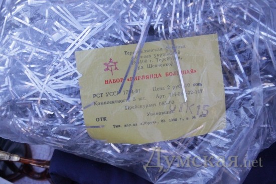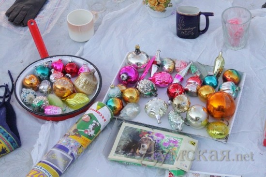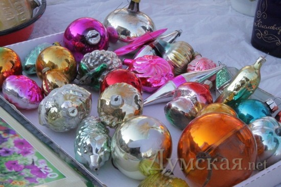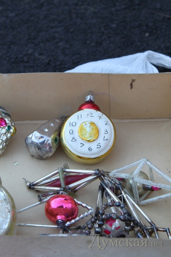 Чего-чего, а вот дефицита елочных игрушек советских времен здесь точно нет. Тем, кто до сих пор ностальгирует по детству – добро пожаловать! Тут и звездочки-верхушки и огурцы-клубнички-зайцы-самолеты. Есть даже аутентичный «дождик» 1990 года – жестковатый и немного колючий как ежик. Цены на игрушки разные, впрочем, как и состояние. Начинается прайс от 2-х и заканчивается сотней грн. Гирлянды (шишки, свечки, ракеты) – нерабочие от 20, рабочие — по 100 грн.