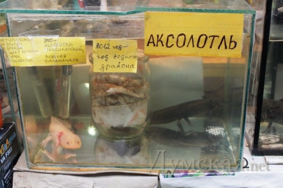 Как известно, новый 2012 год будет проходить под знаком Дракона. Говорят даже, что это будет водяной или черный дракон. К, сожалению, с символами наступающего года на знаменитой одесской барахолке оказалось не густо. Попав в ряды с разной живностью, мы планировали найти что-нибудь живое, например драконоподбных рептилий. К сожалению, таковых не оказалось. Единственными, более не менее, подходящими под необходимые параметры (голова, лапы, хвост, кожа) оказались Аксолотли — мини-игуаны, живущие в воде. Стоят от 200 до 400 грн.