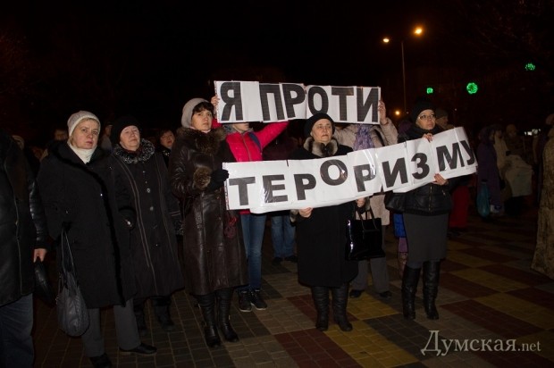 В воскресенье вечером сотни жителей Ильичевска собрались на площади у дворца спорта «Юность», чтобы почтить память мирных жителей Мариуполя, погибших в результате массированного обстрела боевиками жилых районов города.