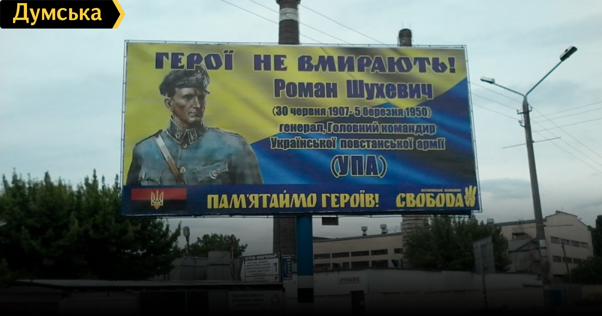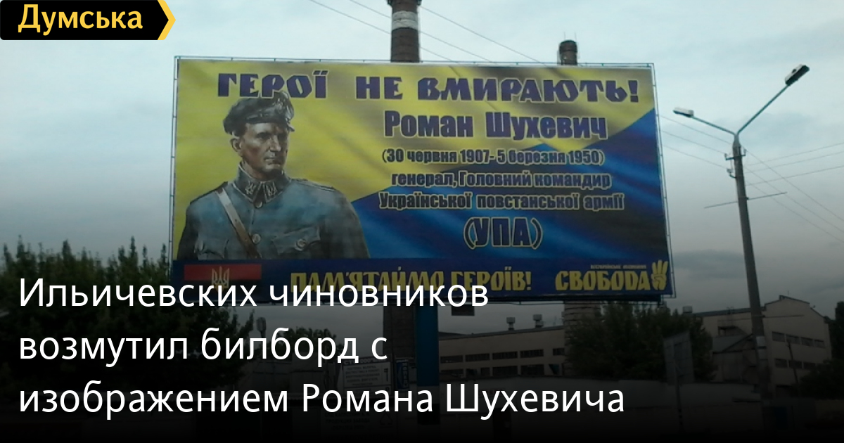 Рекламный щит с изображением Шухевича установлен в рамках просветительского проекта «Помним героев!» Ранее ильичевцев радовали портреты Тараса Шевченко и повстанческого атамана Семена Заболотного, который в годы Гражданской войны боролся против большевиков на территории Одесской области.