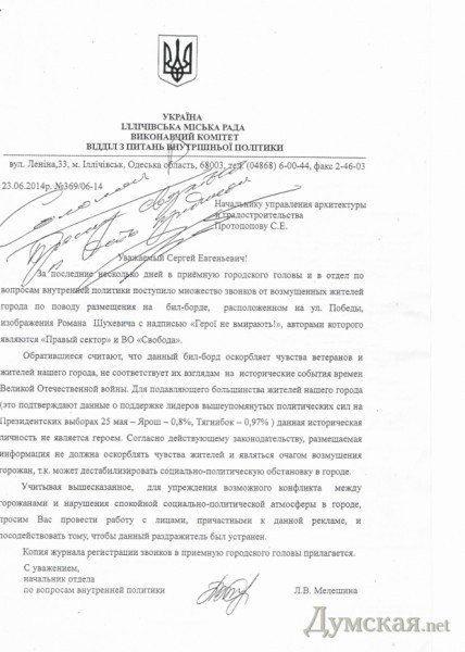По ее словам, в отдел якобы стали поступать звонки от возмущенных горожан. Кроме того, считает чиновник, Роман Шухевич не является героем для подавляющего большинства населения Ильичевска, о чем свидетельствуют результаты последних выборов. Поэтому, мол, размещение этой рекламы может дестабилизировать социально-политическую обстановку в городе.