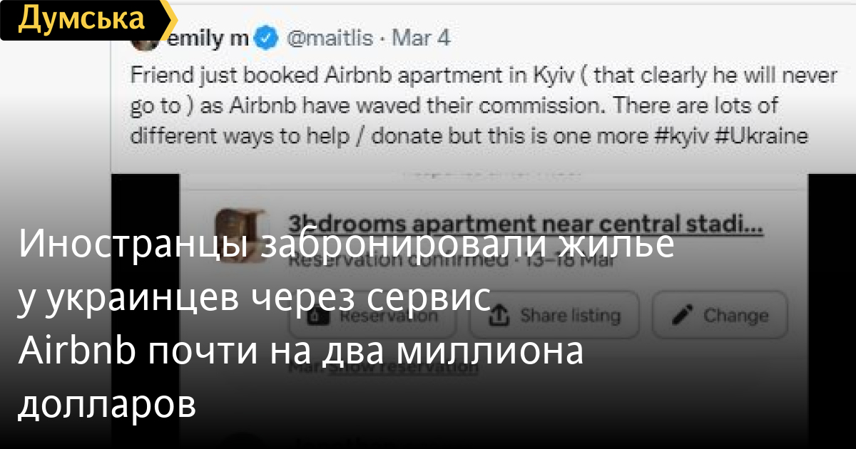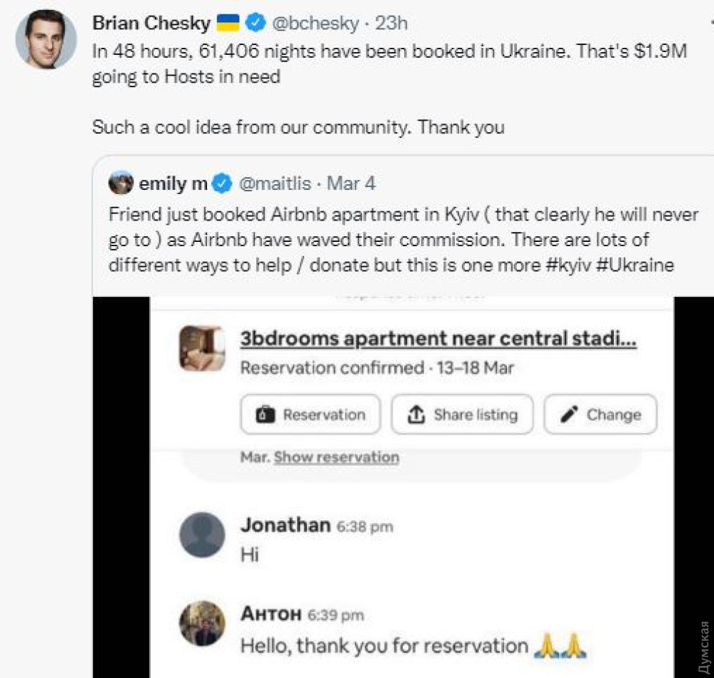 «За 48 часов в Украине забронировано 61 406 ночей. Это 1,9 миллиона долларов для нуждающихся хозяев. Какая классная идея от нашего сообщества», — написал в Tweetter соучредитель компании Брайан Чески.