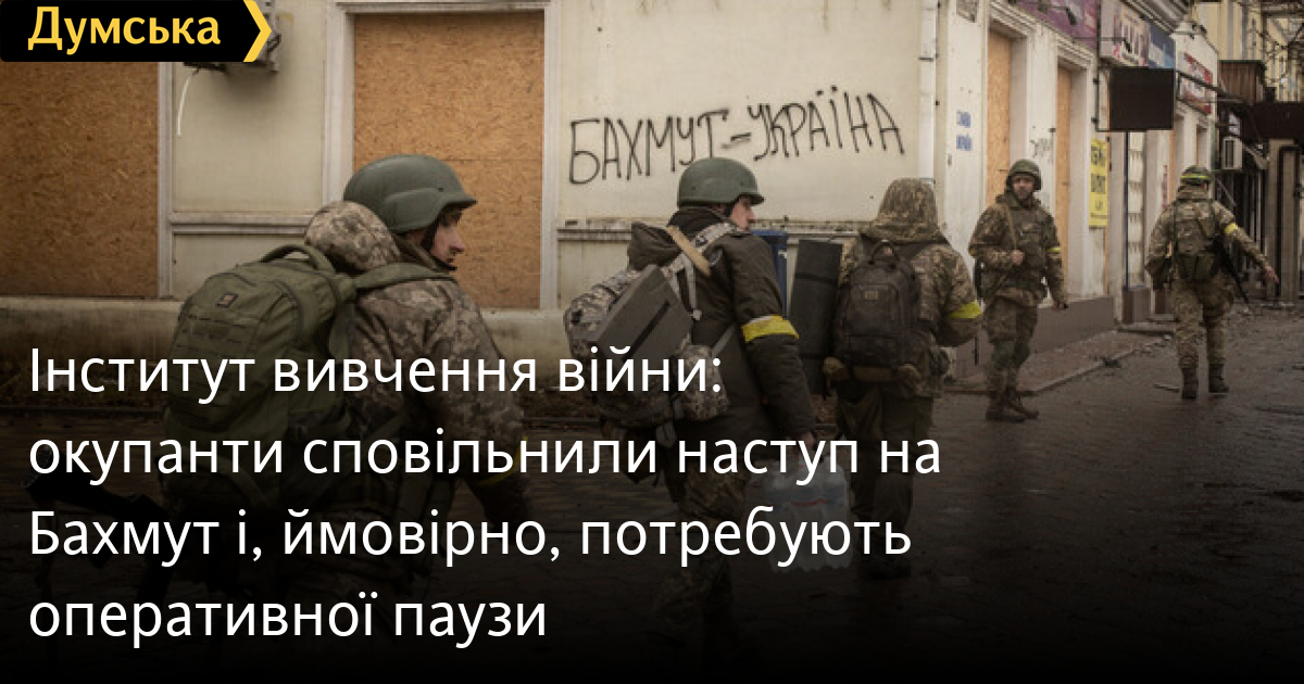 Аналітики вважають, що ще рано сподіватися на те, що рашисти перестануть намагатися захопити Бахмут, однак через наростаючий дефіцит у кількості військ і боєприпасів зараз їм, імовірно, доведеться зробити оперативну паузу.