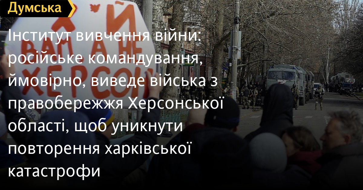 Водночас, аналітики вважають, що окупанти готуються провести «планомірніше та контрольованіше виведення військ із західної частини Херсонської області», щоб не допустити «неконтрольованого відступу», повторного обвалення фронту та численних втрат у живій силі та техніці. Це відведення військ, на думку фахівців Інституту, може статися протягом найближчих кількох тижнів.