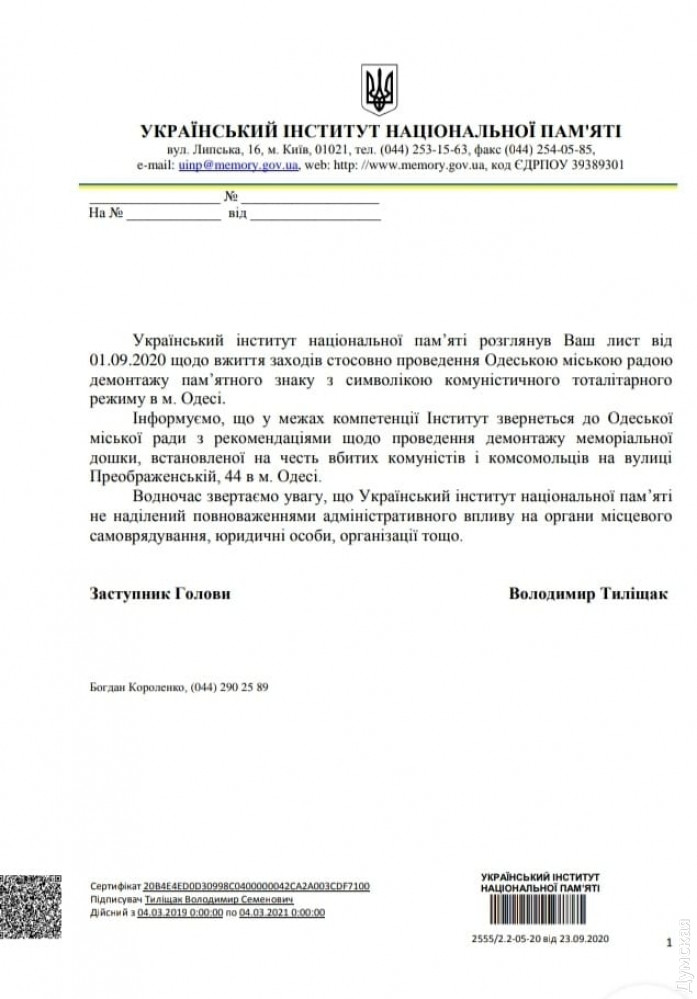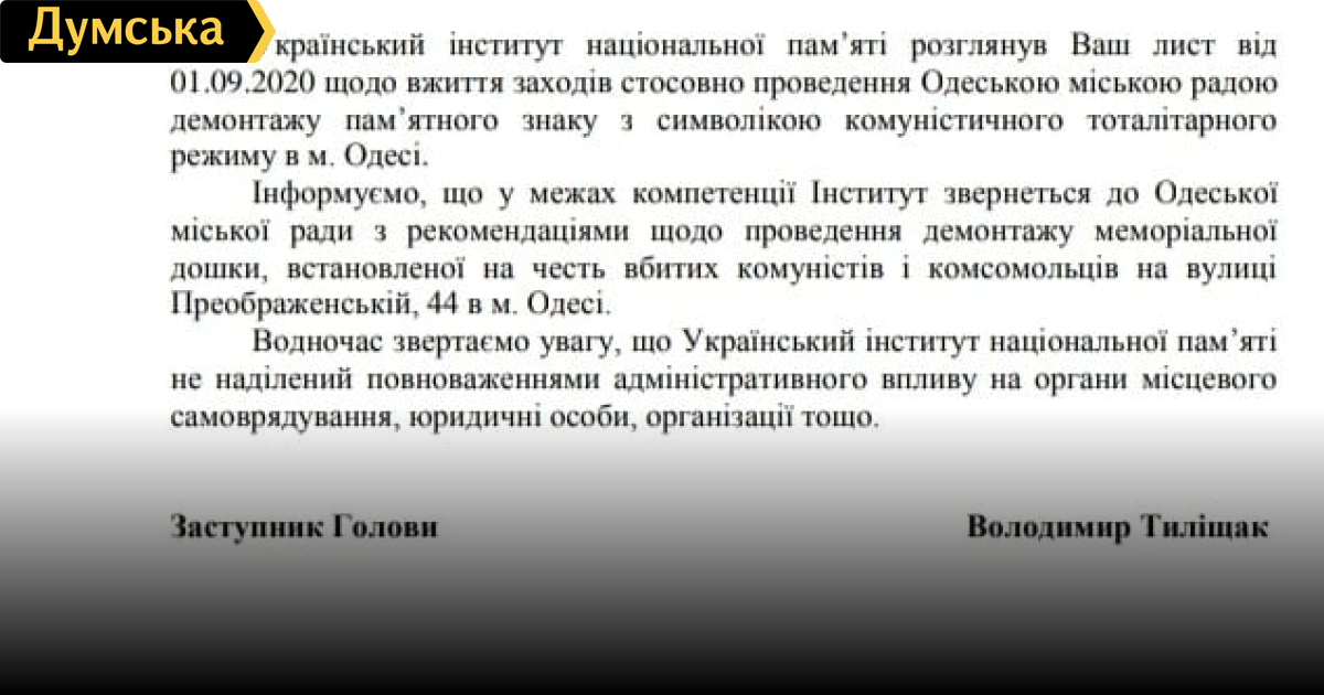 Институт национальной памяти Украины обратился в Одесский горсовет с рекомендациями по поводу демонтажа доски с именами коммунистов, расстрелянных в 1920 году, которая установлена на здании городского управления Нацполиции на Преображенской, 44.