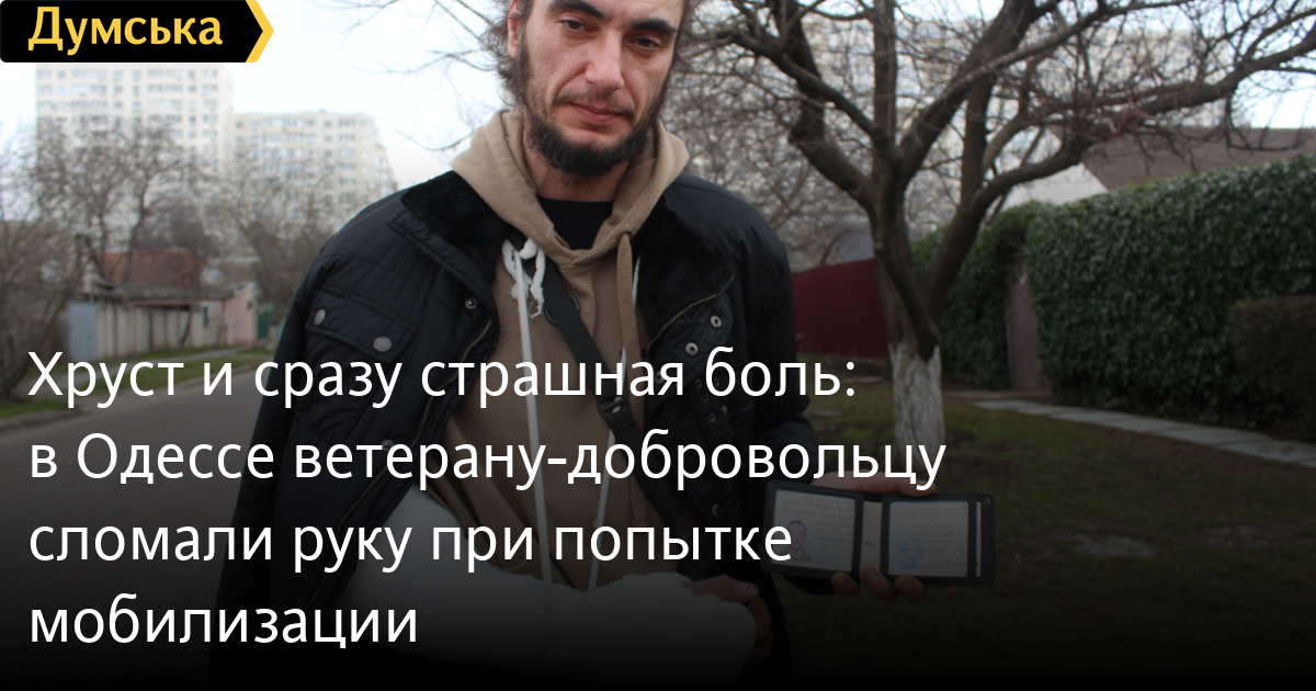 «Хруст и сразу страшная боль»: в Одессе ветерану-добровольцу сломали руку при попытке мобилизацииНеизвестные, представившиеся сотрудниками ТЦК, сломали руку ветерану с инвалидностью на улице Костанди, пытаясь силой затащить его в микроавтобус. Как рассказал пострадавший корреспонденту «Думской», инцидент произошел 16 марта. 40-летний Геннадий Цепюк получил инвалидность — повреждение позвоночника — во время боевых действий летом 2022 года под селом Степовая Долина на херсонском направлении. На войну одессит пошел добровольцем вместе со своими братьями. При этом изначально в ВСУ его брать не хотели: еще до войны он перенес тяжелый перелом ноги, после которого осталась металлическая пластина и шурупы. Служил солдатом-минометчиком в 28-й бригаде. Травму позвоночника и контузию получил в результате прилета снаряда, когда подвозил боеприпасы на позиции. После этого долго лечился, однако последствия травмы до сих пор дают о себе знать — ходит с трудом, иногда отказывают ноги. После госпиталей прошел ВЛК, был освобожден от службы и в 2024 году получил инвалидность третьей группы. До сих пор пытается восстановиться, однако произошедший с ним 16 марта возле дома случай, очевидно, затянет этот процесс — не только физического, но и морального восстановления. «Около 11 часов утра я гулял с собакой возле дома на улице Костанди, — рассказывает Геннадий. — Шел уже домой, вдруг сзади подлетает черный бус. Выскочило четверо мужчин в военной форме, один был в балаклаве. Подлетели ко мне, один говорит, мол, молодой человек, а покажите документы. Ответил им: ребята, я не ваш вариант. Я ветеран, инвалид войны, 22-го года, еле-еле хожу. Недавно после больницы. Показываю удостоверение. Один человек с бодикамерой подошел ко мне. Тоже показал документы свои, но очень быстро, ну, я не успел ознакомиться с ними — все происходило очень быстро». По словам мужчины, после проверки он решил, что на этом все закончено. «Я, когда показал им документы, тот, который с боди-камерой, ответил: ясно, все нормально у тебя. После этого я решил, что все, проверка окончена, и сказал им — ну, что я пошел. Но человек в балаклаве говорит: Нет! Ты поедешь с нами! — он буквально орать начал. В свою очередь я попросил у него его документы предъявить. Он у меня стоял сзади, слева. Я поворачиваюсь к нему, говорю: а вы кто такой? Предъявите документы, пожалуйста, и покажите лицо». Дальше, говорит Геннадий, ситуация резко обострилась. «Мои слова вызвали буквально истерику и агрессию — мужчина в балаклаве, очень массивный, схватил меня за одежду и начал тащить к машине. Другие тоже подключились, схватив меня за руки-ноги, тащили в машину. В проеме буса я вцепился в стойку авто, уперся руками и ногами. Я был в шоке — какие-то люди набросились на меня и пытаются похитить прямо под домом. Притом, что я изначально показал удостоверение ветерана войны! Во-вторых, у меня собака на поводке — ее что, бросить просто так на улице?». Мужчина отмечает, что пытался сопротивляться. «Естественно, я сопротивлялся, это чудовищная ситуация — неизвестные люди бросаются на человека и ломают его. Вдруг ощутил страшную боль и хруст в руке! Был болевой шок, почти потерял сознание. Меня таки затащили в машину и бросили на пол. Но когда я начал кричать, они поняли, что что-то пошло не так — моя рука приняла неестественное положение и б