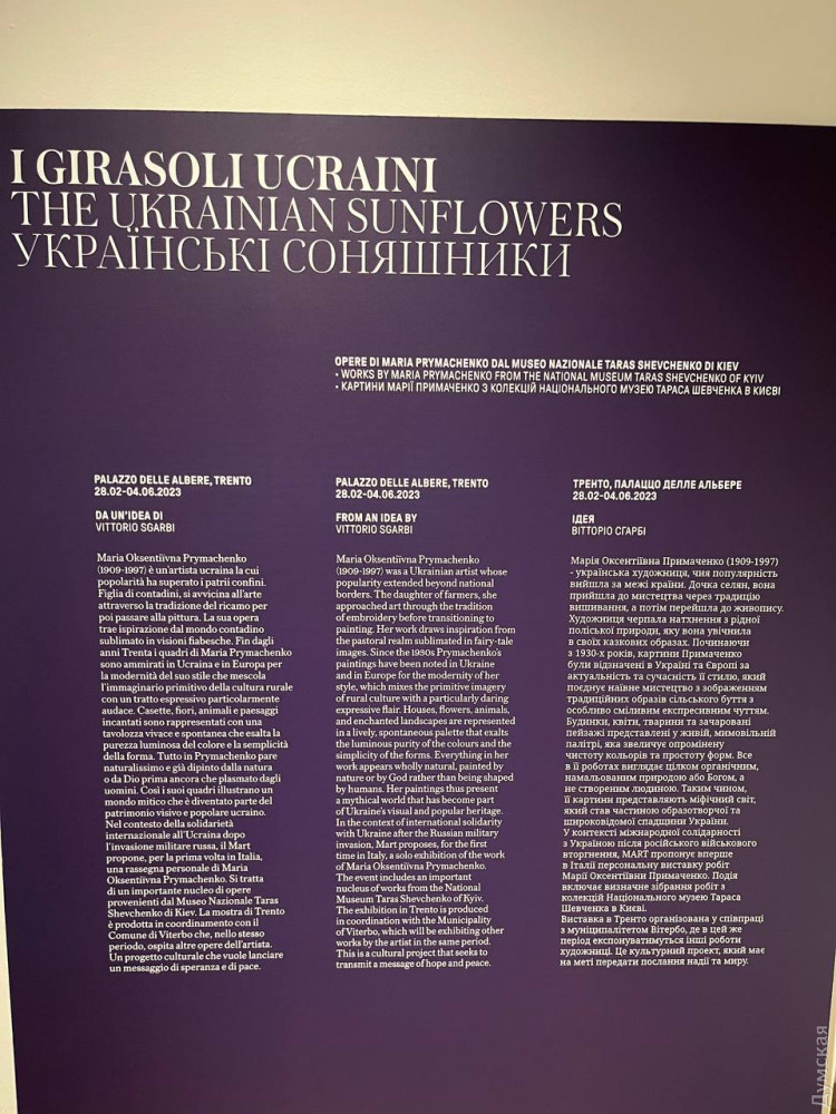Мистецтво, врятоване з вогню війни: в Італії вперше проходять виставки робіт всесвітньо визнаної української художниціІталійці знайомляться з творчістю однієї з найвідоміших і фундаментально значущих для світової культури українських художниць ХХ століття Марії Приймаченко. Одразу дві виставки робіт Приймаченко проходять зараз в Італії. Одна з них відкрилася у Палаццо дей Пріорі в місті Вітербо неподалік від Риму, а друга — у старовинній віллі-фортеці Палаццо делле Альбере в Тренто, приблизно за півтори години їзди від Верони. На другій виставці побував кореспондент «Думської». Обидві виставки організував Музей сучасного мистецтва Тренто і Роверето. Це один із головних музеїв сучасного мистецтва в Італії, який організував першу в країні велику виставку Приймаченко у співпраці з Київським національним музеєм Тараса Шевченка. У Тренто експонують близько 60 робіт з різних періодів творчості Марії Приймаченко — це і картини в абстрактному анімалістичному стилі (фантастичні леви, мавпи, слони та інші представники фірмової фауни Приймаченко), сюжетні роботи, що розповідають життєві історії (або вірніше сказати — казки, іноді навіть з підписами на полотні) людей і тварин на них, і драматичні побутові сцени (наприклад, кілька картин з доглянутими могилами, чоловік, що спить в обіймах з пляшкою горілки в оточенні тварин і т. д.). Об'єднує все це розмаїття властивий творчості Марії Приймаченко стиль народного примітивізму. Художниця-самоучка, яка прожила 89 років, ніколи не отримувала профільної освіти, черпала натхнення з природи та подій, що відбувалися в її житті. Незважаючи на це, її роботи ще в 1930-х роках отримали міжнародне визнання, пізніше її стилем захоплювалися Сальвадор Далі та Пабло Пікассо. Марія Приймаченко прожила все життя в селі Болотня Київської області. На початку повномасштабного вторгнення нацистської росії її мала батьківщина на кілька тижнів потрапила під окупацію. Рашисти вторглися і в сусіднє селище Іванків, де в історико-краєзнавчому музеї зберігалися кілька десятків робіт Приймаченко. Після влучання ворожого снаряда музей згорів — жителі селища, ризикуючи життями, рятували картини з палаючої будівлі. Музей MART в анотації до виставки вказує, що організував експозицію на знак солідарності з Україною. Зазначимо, що виставка користується популярністю — італійці з цікавістю розглядають роботи легендарної української художниці. Кілька відвідувачів виставки розповіли нашому кореспондентові, що провели в дорозі не одну годину, щоб побачити роботи Марії Приймаченко. Автор — Іван Яремчук СМЕРТЬ РОСІЙСЬКИМ ОКУПАНТАМ! Помітили помилку? Виділяйте слова з помилкою та натискайте control-enter |