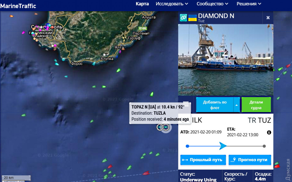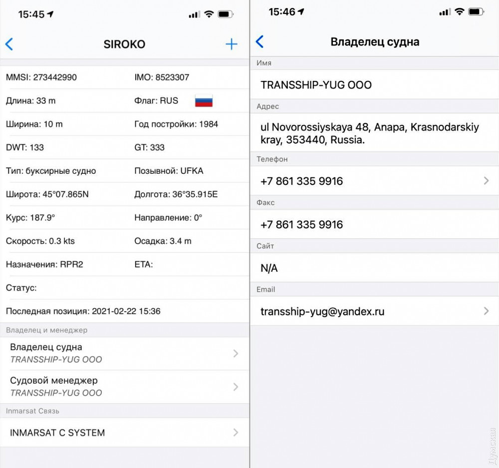 Интересно, что на этой же рейдовой стоянке рядом с «Топазом» и «Даймондом» стоят еще несколько судов одесской компании – балкер «Афина» и буксир Siroko. Данные последнего говорят о том, что его владельцем является российская компания TRANSSHIP– YUG OOO, а юридический адрес — Краснодарский край, город Анапа, ул. Новороссийская, 48.