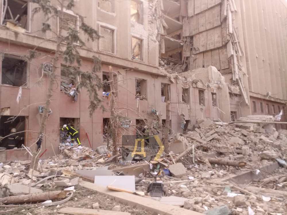 Около разрушенного здания областной военной администрации в Николаеве продолжаются спасательные работы.
