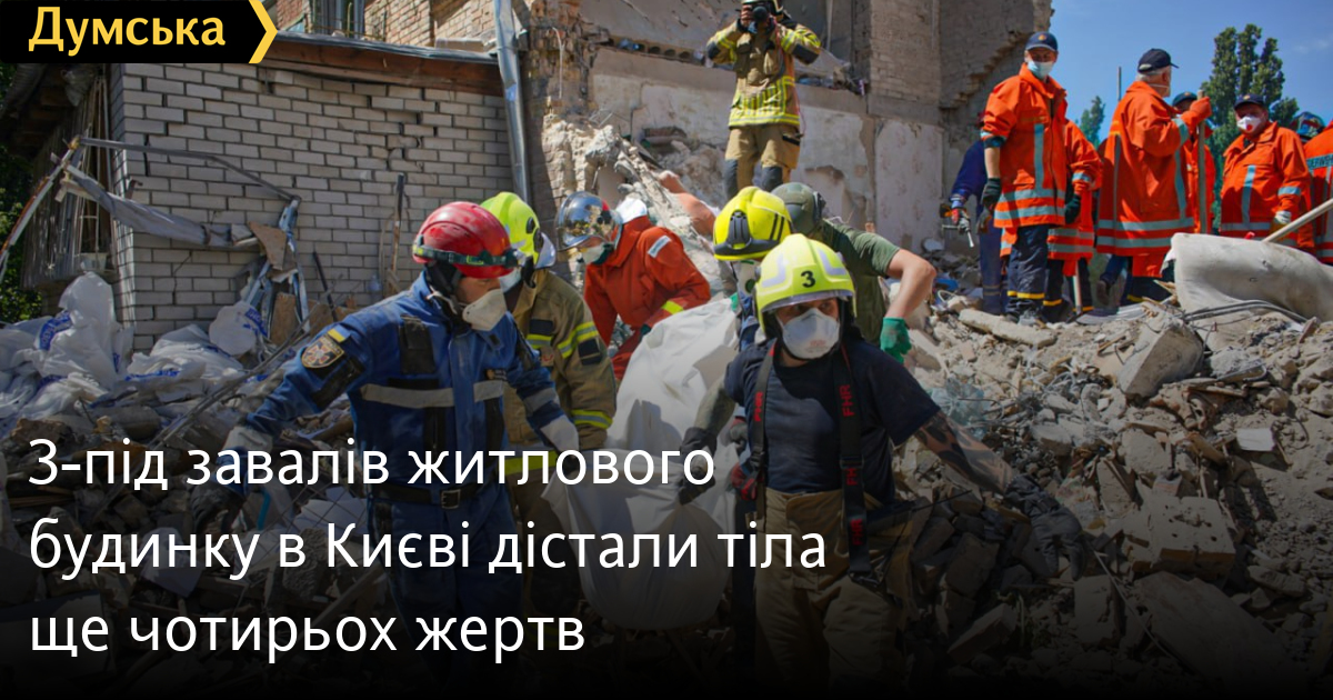 Тіла трьох жінок і чоловіка дістали рятувальники з-під завалів житлового будинку в Шевченківському районі Києва, який постраждав внаслідок вчорашнього обстрілу.