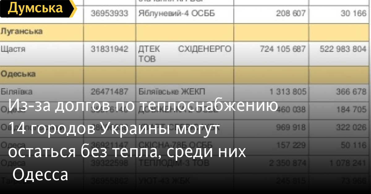Из-за долгов по теплоснабжению 14 городов Украины могут остаться без тепла, среди них – Одесса16 производителей тепла в Украине находятся в зоне риска отключения от газоснабжения с 1 марта 2020 года из-за долгов. Как сообщила пресс-служба «Нафтогаза», с 19 февраля 36 предприятий-должников из 52 внесли необходимые минимальные платежи и избежали риска отключения от газоснабжения. Но 16 производителей, которые не выполняют ни одно из условий по расчетам, предусмотренным положением о ПСО, все еще остаются в зоне риска. «Нафтогаз» направил официальные письма этим предприятиям о необходимости срочно произвести оплаты, чтобы избежать отключений. Стоит отметить, что в числе городов, оказавшихся под угрозой отключения, оказалась и Одесса. Здесь сразу три предприятия имеют долги перед «Нафтогазом». В таблице указан перечень предприятий-должников. СМЕРТЬ РОССИЙСКИМ ОККУПАНТАМ! Заметили ошибку? Выделяйте слова с ошибкой и нажимайте control-enter |