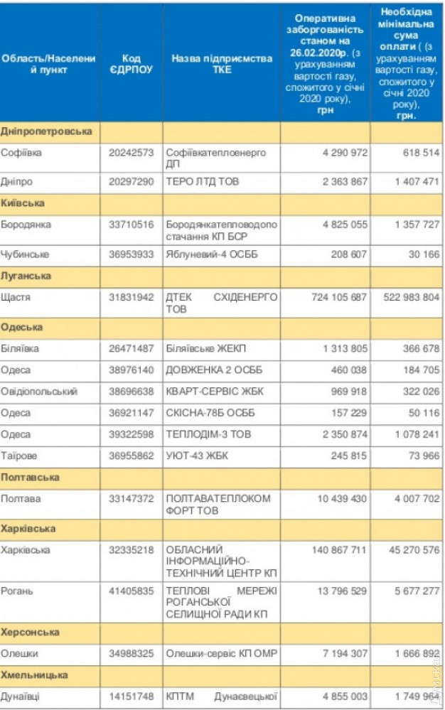 Из-за долгов по теплоснабжению 14 городов Украины могут остаться без тепла, среди них – Одесса16 производителей тепла в Украине находятся в зоне риска отключения от газоснабжения с 1 марта 2020 года из-за долгов. Как сообщила пресс-служба «Нафтогаза», с 19 февраля 36 предприятий-должников из 52 внесли необходимые минимальные платежи и избежали риска отключения от газоснабжения. Но 16 производителей, которые не выполняют ни одно из условий по расчетам, предусмотренным положением о ПСО, все еще остаются в зоне риска. «Нафтогаз» направил официальные письма этим предприятиям о необходимости срочно произвести оплаты, чтобы избежать отключений. Стоит отметить, что в числе городов, оказавшихся под угрозой отключения, оказалась и Одесса. Здесь сразу три предприятия имеют долги перед «Нафтогазом». В таблице указан перечень предприятий-должников. СМЕРТЬ РОСІЙСЬКИМ ОКУПАНТАМ! Помітили помилку? Виділяйте слова з помилкою та натискайте control-enter |