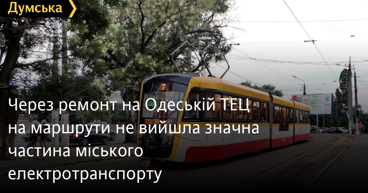 Через ремонт на Одеській ТЕЦ на маршрути не вийшла значна частина міського електротранспортуКількість трамваїв і тролейбусів, які сьогодні вийшли на маршрути, значно менша, ніж у звичайні дні, через ремонтні та профілактичні роботи на Одеській ТЕЦ. Як повідомили у пресслужбі одеської мерії, у зв'язку з цим інтервал руху транспорту значно збільшився. Так, на маршрути тролейбусів №3, №8 і №9 випустили тільки 50% складу. Також половина вагонів вийшла на трамвайні маршрути №15, №12, №21 і №28. Трамвай №20 взагалі не ходить. Нагадаємо, що сьогодні через ремонтні роботи на ТЕЦ буде частково обмежено електропостачання до 17:00 у Приморському, Хаджибейському та Пересипському районах. Перевірити відключення за вашою адресою можна в чат-боті Viber і Telegram. Помітили помилку? Виділяйте слова з помилкою та натискайте control-enter |