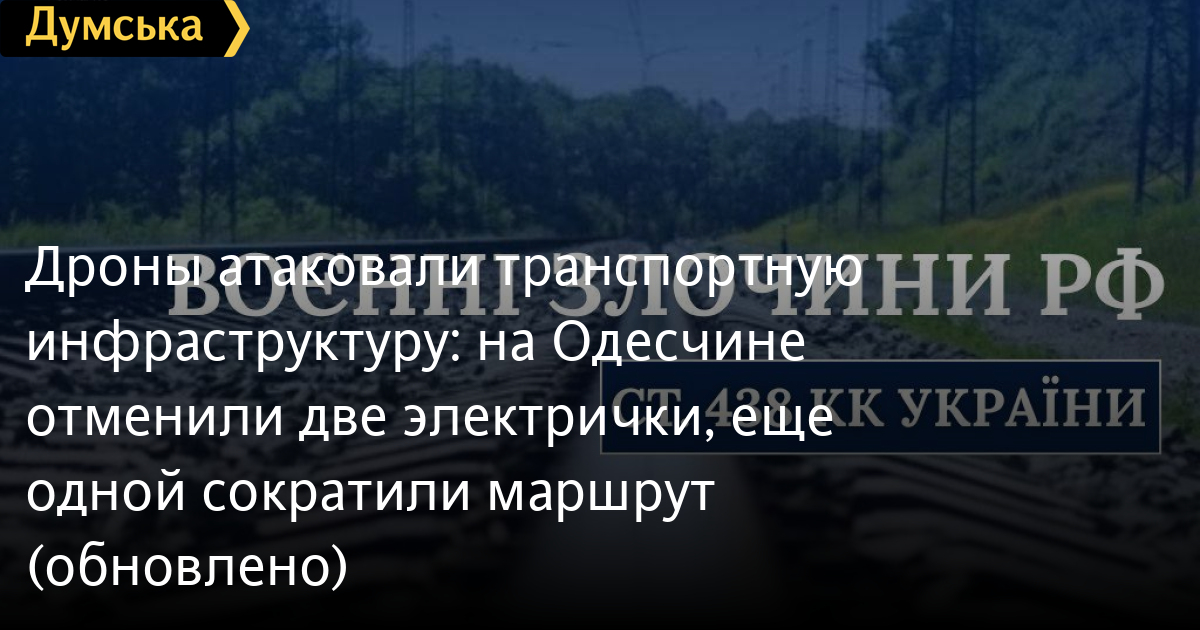 Дрони вдарили по транспортній інфраструктурі: на Одещині скасували дві електрички, ще одній скоротили маршрут (оновлено)Два приміські потяги тимчасово не курсують через російський обстріл у ніч проти 27 вересня. Ідеться про електрички Вапнярка-Одеса (№6251, №6253, №6255) та Подільськ-Слобідка (№7024), повідомили в «Укрзалізниці». Крім того, електричка Слобідка – Одеса (№7021) скоротить маршрут до Подільська – Одеса. «Відновлення інфраструктури триває, низка поїздів курсуватиме із резервними тепловозами», — заявили в Укрзалізниці. ОНОВЛЕНО О 9:30. Як повідомили у прокуратурі Одещини, ворог атакував транспортну інфраструктуру Подільського району ударними дронами. СМЕРТЬ РОСІЙСЬКИМ ОКУПАНТАМ! Помітили помилку? Виділяйте слова з помилкою та натискайте control-enter |