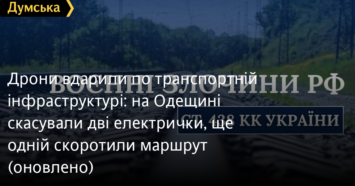 Дрони вдарили по транспортній інфраструктурі: на Одещині скасували дві електрички, ще одній скоротили маршрут (оновлено)Два приміські потяги тимчасово не курсують через російський обстріл у ніч проти 27 вересня. Ідеться про електрички Вапнярка-Одеса (№6251, №6253, №6255) та Подільськ-Слобідка (№7024), повідомили в «Укрзалізниці». Крім того, електричка Слобідка – Одеса (№7021) скоротить маршрут до Подільська – Одеса. «Відновлення інфраструктури триває, низка поїздів курсуватиме із резервними тепловозами», — заявили в Укрзалізниці. ОНОВЛЕНО О 9:30. Як повідомили у прокуратурі Одещини, ворог атакував транспортну інфраструктуру Подільського району ударними дронами. СМЕРТЬ РОСІЙСЬКИМ ОКУПАНТАМ! Помітили помилку? Виділяйте слова з помилкою та натискайте control-enter |