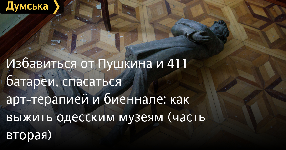 Позбутися Пушкіна і 411 батареї, рятуватися арт-терапією і бієнале: як вижити одеським музеям (частина друга)З початком великої війни витрати на утримання музеїв різко скоротилися. Колекції вивезли в безпечні місця або просто сховали, співробітників перевели на половинну ставку, а то й зовсім відправили «на простій» (людина не працює і не отримує зарплату, але й не звільнена) Хтось і зовсім втратив роботу, інші захищають Україну зі зброєю в руках. Музейники могли вибрати: підійти до проблеми формально, працюючи з 10:00 до 16:00 тільки в будні, або стати на військові рейки, «придумати» експозиції, заробляти на мерчі. Ми вивчили роботу одеських музеїв і дійшли висновку — намагається вижити кожен. Однак далеко не всі готові виходити за рамки звичної рутинної роботи. Наші музейники досконало опанували мистецтво виживання. У другій частині нашого матеріалу розповідаємо, як Краєзнавчий позбавляється від «Старої Одеси» і мріє переписати долю 411-ї батареї, Літературний вже позбувся Пушкіна, Блещунов проводить арт-терапію та оцифровує колекції, а Музей сучасного мистецтва подумує повернути частину експозиції й готує Чорноморську бієнале. У першій частині читайте про мерч на місці Костанді в Художньому музеї, невизначеність з фондами Археологічного та європейське турне Західного і Східного. КРАЄЗНАВЧИЙ ПРАЦЮЄ, АЛЕ ХОЧЕ ПОЗБУТИСЯ 411-Ї Краєзнавчий музей, що на Гаванній — один з небагатьох, повністю відкритий для відвідування. Але тільки по буднях, що, погодьтеся, дивно. Працює і філія «Степова Україна» на Ланжеронівській. А ось музей меморіалу 411-ї батареї (теж філія) чомусь закритий. Ба більше, всі його експонати вивезли та помістили в підвали основної будівлі. Сам меморіал веде жалюгідне існування, про що ми багато писали. На жаль, в.о. директора Краєзнавчого Юрій Слюсар говорити з нами не захотів, тому про ситуацію в установі доводиться судити лише зі слів окремих співробітників. «Працює майже все, включаючи зброярню. Нічого не евакуювали (і правильно зробили, червоного списку тут просто немає, — Ред.). Прибрали тільки експозицію «Стара Одеса» з дореволюційними речами й чомусь експозицію, присвячену Другій світовій (мабуть, криво прочитали Закони про деколонізацію і декомунізацію, і вирішили перестрахуватися). Все інше відкрито для відвідування», — розповів нам один із працівників музею. Частину колективу перевели на половинні ставки, частину відправили на «простій», але обійшлося без звільнень, продовжує він. Цікаво з 411-ю батареєю. Керівництво облради та нинішня дирекція музею серйозно розглядають варіант виділення її в окрему юридичну особу. «Краєзнавчий хоче позбутися батареї, це факт. Хочеться вірити, що це буде нове життя, нове нормальне керівництво, нова концепція і що всі гроші, які заробляє батарея від розміщення комерційних об'єктів, підуть на її розвиток. Але поки все повисло в повітрі», — говорить співрозмовник «Думської». ЛІТЕРАТУРНИЙ БЕЗ ПУШКІНА: ТРАНСФОРМАЦІЯ ПІД ОБСТРІЛАМИ Проблема трансформації в нових реаліях гостро стоїть перед Літературним музеєм. Спочатку зосереджений майже виключно на російськомовній культурі, він активно змінюється, доповнюючи свої колекції артефактами, пов'язаними з українськими та іншими пластами. Намагається відповідати, словом. У 2023 році в будівлі на Ланжеронівській — а це палац Гагаріна 