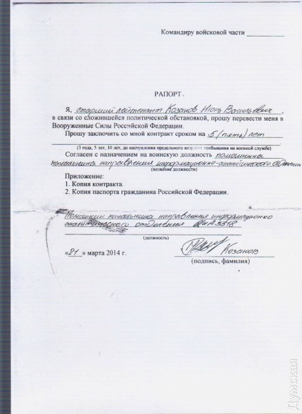Вообще-то это надо было сделать намного раньше. «Думская» уже рассказывала об Игоре Казакове. Он служил в Крыму, но в критический момент, 24 февраля 2014 года, дезертировал. Через месяц поступил на службу в ЧФ РФ. «Новой родине» офицер прослужил недолго — уже через три дня его уволили за пьянку на рабочем месте.