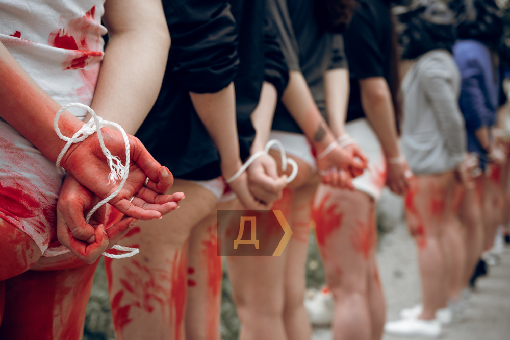 Девушки в «окровавленном» нижнем белье с черными пакетами на головах и завязанными за спиной руками стояли лицом к российскому консульству: в зверствах, происходящих в Украине и называемых «спецоперацией», виноват не только президент рф, но и все россияне.