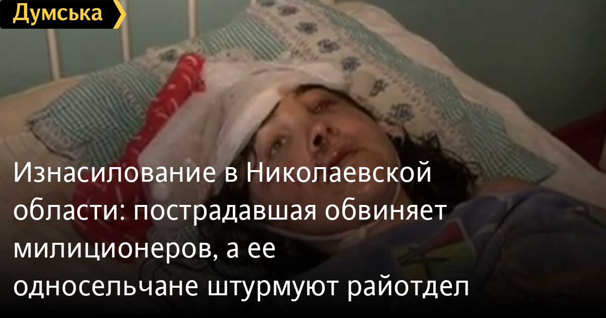 Изнасилование в Николаевской области: пострадавшая обвиняет милиционеров, а ее односельчане штурмуют райотделВ Николаевской области жительницу села Врадиевка изнасиловали и избили два милиционера. По словам потерпевшей, 29-летней Ирины, над ней надругались старший лейтенант милиции Евгений Дрижак и лейтенант Дмитрий Полищук. По словам Ирины К. в 23:30 26 июня она возвращалась домой с дискотеки. На улице Маяковского рядом с ней остановился автомобиль, и один из сидевших в нем мужчин предложил подвезти. Ирина отказалась и тогда ее силой втянули в машину. В салоне авто сидели офицеры милиции — старший лейтенант Евгений Дрижак и лейтенант Дмитрий Полищук — а за рулем был местный таксист Сергей Рябиненко. Затем, как утверждает потерпевшая, ее завезли в посадку недалеко от села Сырово, находящегося примерно в шести километрах от Врадиевки. Далее со слов Ирины, в лесополосе ее вытащили из машины и начали жестоко избивать, забрали сумку, сорвали серьги, цепочку, всю одежду. Затем, затолкав обратно в машину, Евгений Дрижак изнасиловал ее, после чего предложил Дмитрию Полищуку сделать тоже самое и тот не стал отказываться. По словам пострадавшей, водитель такси участия в изнасиловании не принимал, но зато отличился в другом: бил ее по голове даже тогда, когда ее насиловали. После всех издевательств Ирину выбросили из машины и уехали, а девушка осталась лежать в лесополосе. Однако через некоторое время мучители вернулись и принялись ее искать. Ирина с большим трудом смогла отползти и затаиться в траве. На стороне девушки оказалась темная ночь и высокая трава — насильники ее не нашли. Только рано утром девушка смогла добраться до мельницы, где ей вызвали скорую. Медики диагностировали у нее открытый перелом черепа в нескольких местах, множественные рваные раны лица пять глубоких резаных ран головы, множественные ушибы и ссадины. Расследование дела ведет прокуратура. По решению следователя, двое участников преступления — лейтенант милиции Дмитрий Полищук и таксист Сергей Рябиненко — были задержаны. А вот Евгений Дрижак остался на свободе, у него якобы есть алиби: оказывается, в вечером 27 июня милиционер дежурил и никуда не отлучался из райотдела, о чем показывает видеорегистратор. В настоящее время прокуратура проверяет, было ли вмешательство в видеозапись.