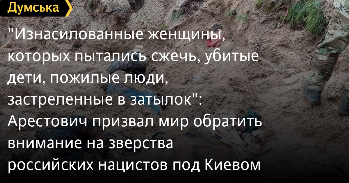 «Эти освобожденные города представляют собой картинку из фильма ужасов, — сказал Арестович. — Среди уже найденных жертв российских войск: изнасилованные женщины, которых пытались сжечь, представители местного самоуправления, убитые дети, пожилые люди, мужчины. У многих связаны руки, есть следы пыток. Люди убиты выстрелами в затылок».