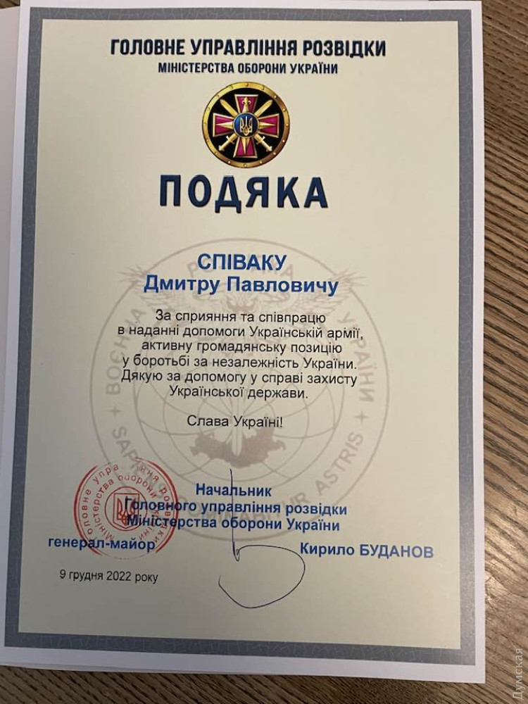 Екс-депутат Одеської міськради VI скликання Дмитро Співак похвалився подяками від Головного управління розвідки Міністерства оборони України та 36-ї окремої бригади морської піхоти імені контр-адмірала Михайла Балинського.