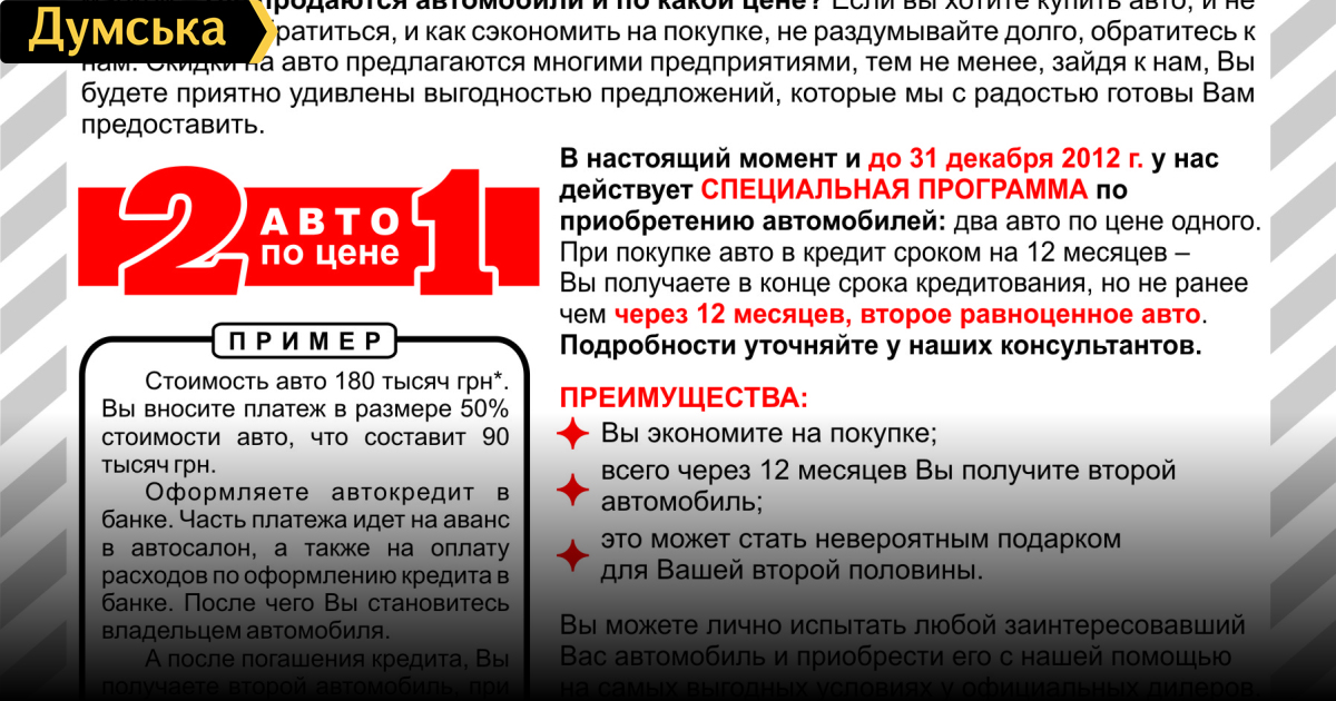 Необычную акцию объявила фирма «Ареал – Юг». Одесситам предлагают в период до 31 декабря 2012 года оформить кредит на любой новый автомобиль и получить второй автомобиль такой же стоимости через 12 месяцев, когда кредит будет выплачен.