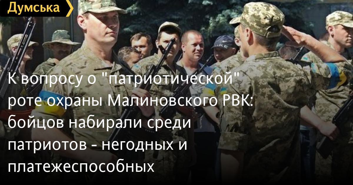 Вот такая история. От себя добавим, что «Думская» в лице главного редактора не призывала отправить всех патриотов в АТО, как, судя по всему, кое-кто подумал. Речь в колонке шла совсем о другом. Все военнослужащие роты охраны являются гражданами, призванными по мобилизации. Соответственно, повторно их уже не призовут. Между тем, в отличие от нормальных мобилизованных, которые сначала отправляются в учебку, а потом распределяются по частям, живут либо в казармах, либо в полевых лагерях, постоянно совершенствуют навыки обращения с оружием — одним словом, полноценно служат, — «охранники» Малиновского РВК в отрыве от семей были лишь один раз, во время коротких учебных сборов. В остальном они ведут самую обычную гражданскую жизнь, о чем и мечтать не могут тянущие солдатскую лямку Кольки и Ваньки из Кодымы и Сараты. Думаете, это справедливо? Мы считаем, что нет.