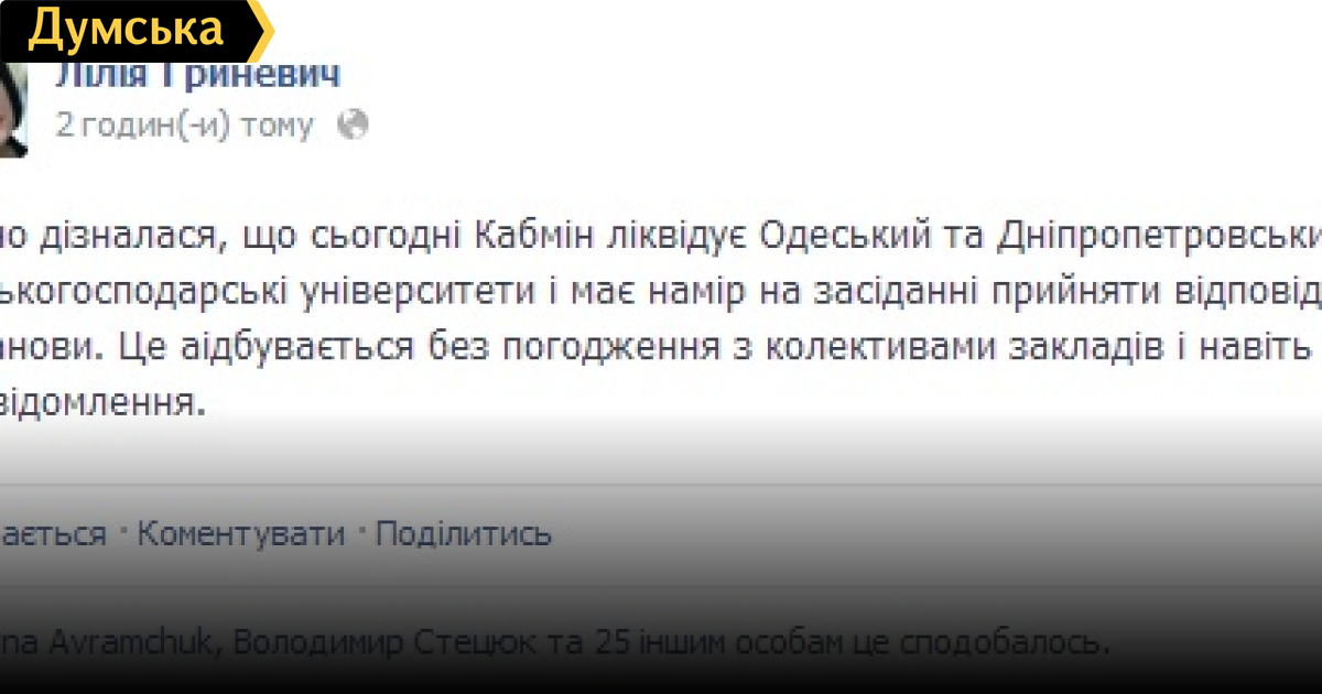 «Только что узнала, что сегодня Кабмин ликвидирует Одесский и Днепропетровский сельскохозяйственные университеты и намерен на заседании принять соответствующие постановления. Это происходит без согласования с коллективами заведений и даже без уведомления», — отметила Гриневич.