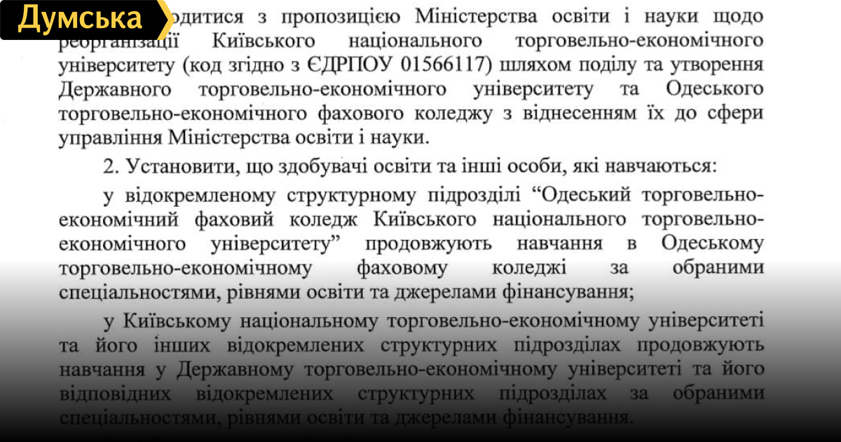 Кабмин сделал Одесский торгово-экономический колледж самостоятельным учебным заведением (документ)Кабинет министров Украины реорганизовал Киевский национальный торгово-экономический университет. Такое решение правительство приняло на сегодняшнем своем заседании. Оно выделило в качестве самостоятельного учебного заведения Одесский торгово-экономический профессиональный колледж, который ранее входил в состав КНТЭУ. Сам вуз переименовали в Государственный торгово-экономический университет. СМЕРТЬ РОСІЙСЬКИМ ОКУПАНТАМ! Помітили помилку? Виділяйте слова з помилкою та натискайте control-enter |