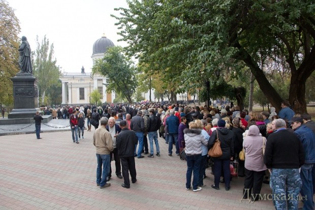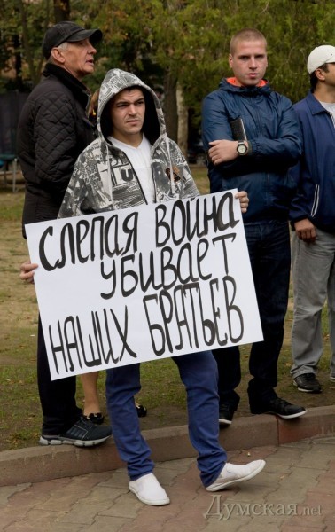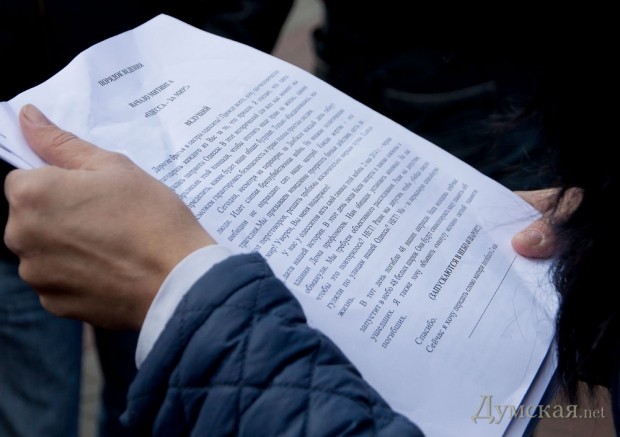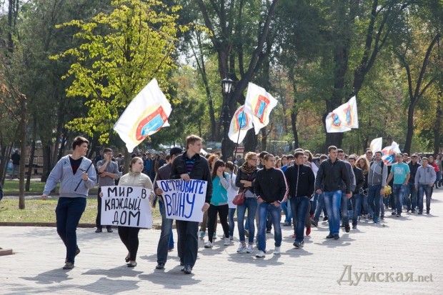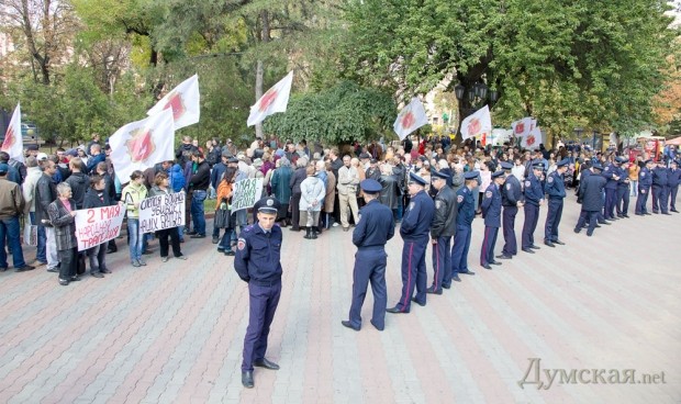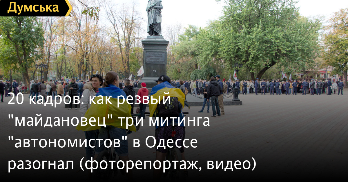 Наиболее душевным было их общение с любителями России, которые собрались на Соборке, за памятником графу Воронцову, чтобы потребовать автономии. В руках путинцы держали странные флаги с гербами Одессы на белом фоне. Было видно, что в отсутствие лидеров участники акции, люди преимущественно пожилого возраста, растерялись. Сначала они выстроились в колонну, чтобы пойти по городу, но беседа с «майдановцами» остудила их пыл. Свою роль сыграла и милиция, перекрывшая «автономистам» путь на Куликово поле.