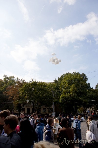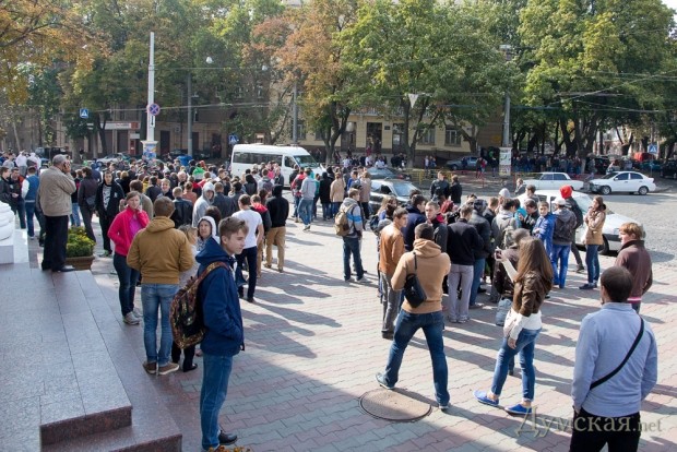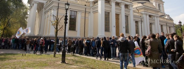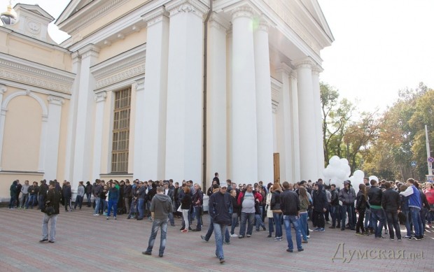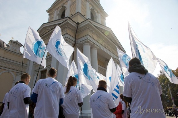 Спустя полчаса возле собора появилась еще одна организованная колона студентов, на этот раз с флагами, изображающими герб Одесской области — опять-таки на белом фоне (!). Люди Резвушкина развернули и их.