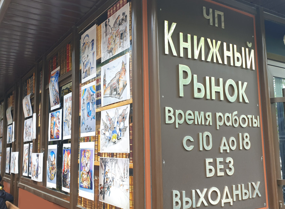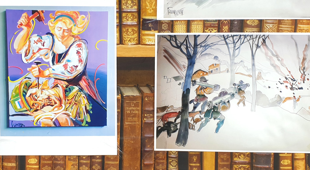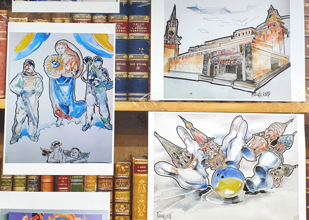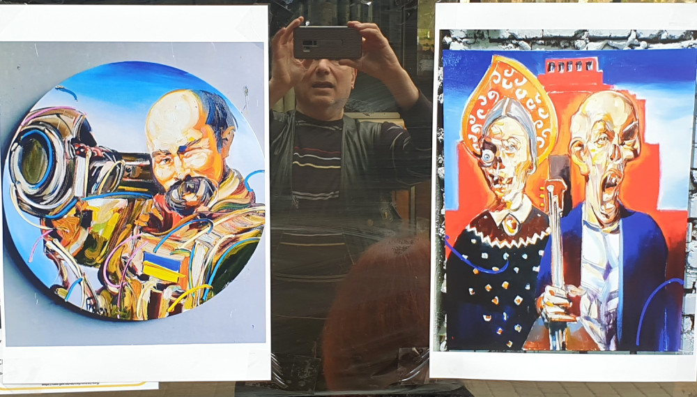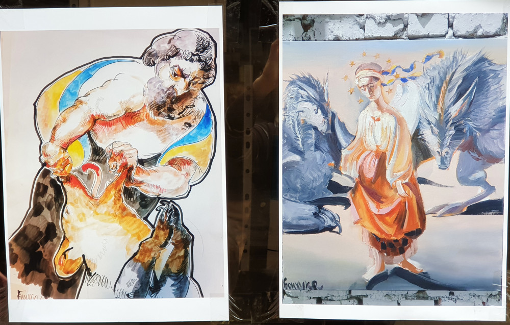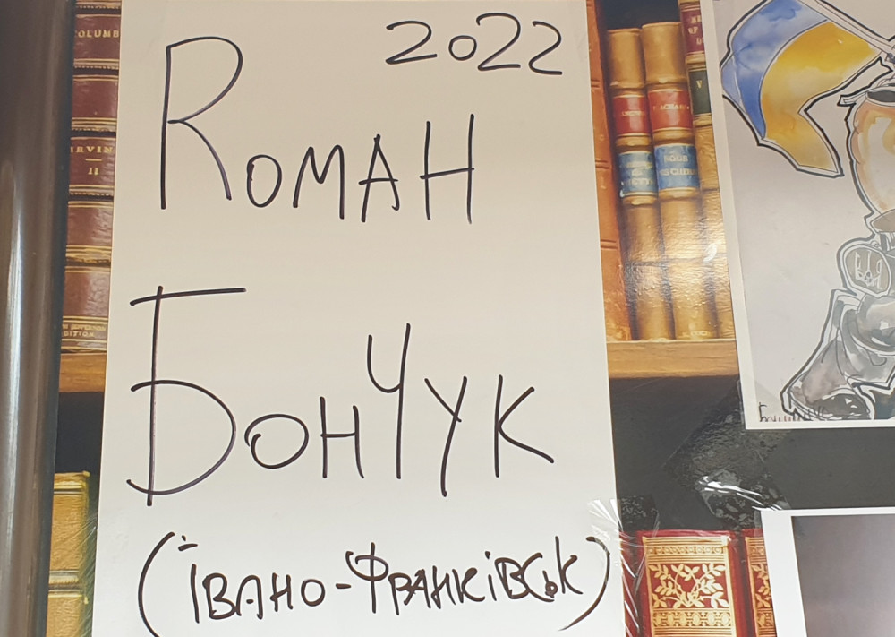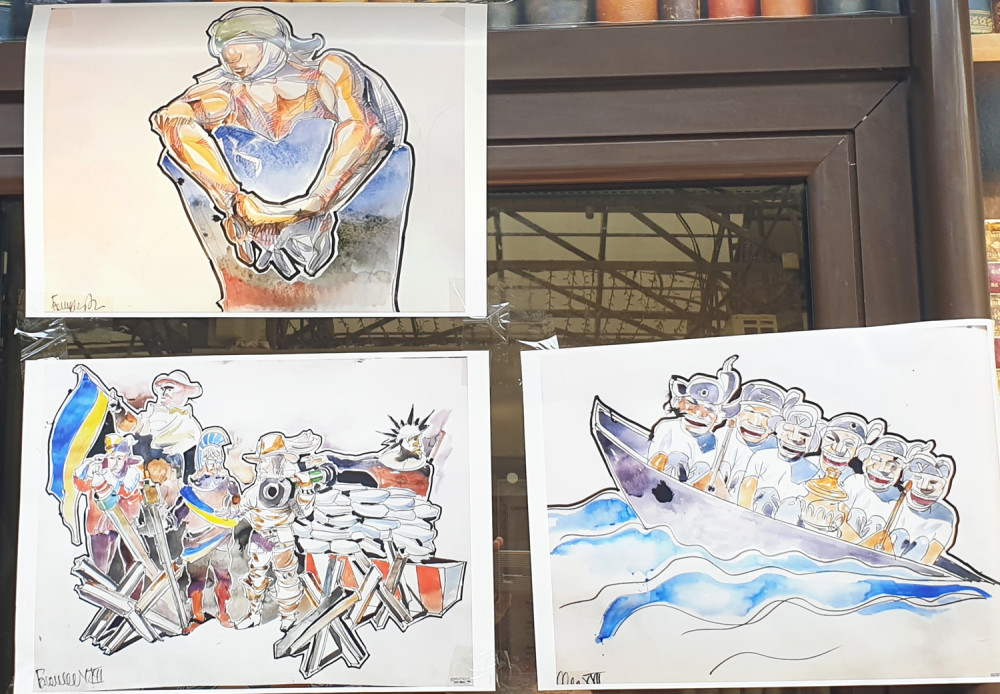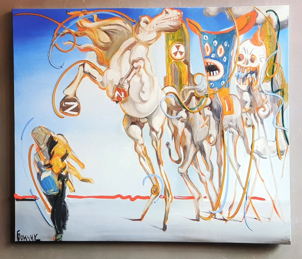 Новая выставка антивоенного украинского искусства на книжном рынке, что на Александровском бульваре, знакомит со свежими произведениями художника из Ивано-Франковска Романа Бончука, автора проекта первого в Украине музея Небесной сотни, а также гигантского полотна «Хроники Украины-Руси».