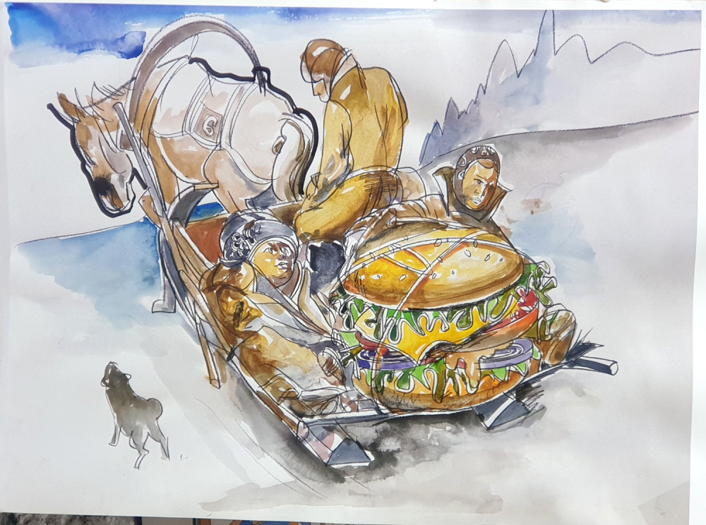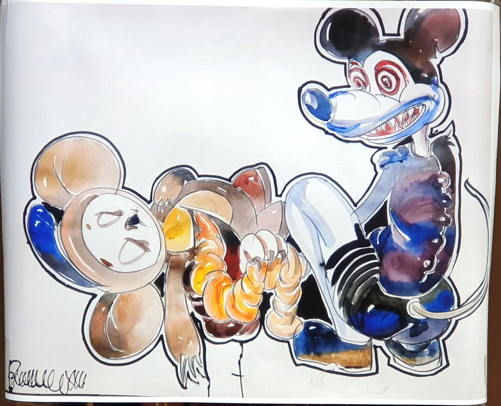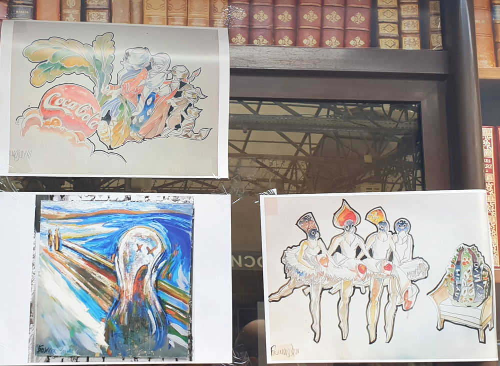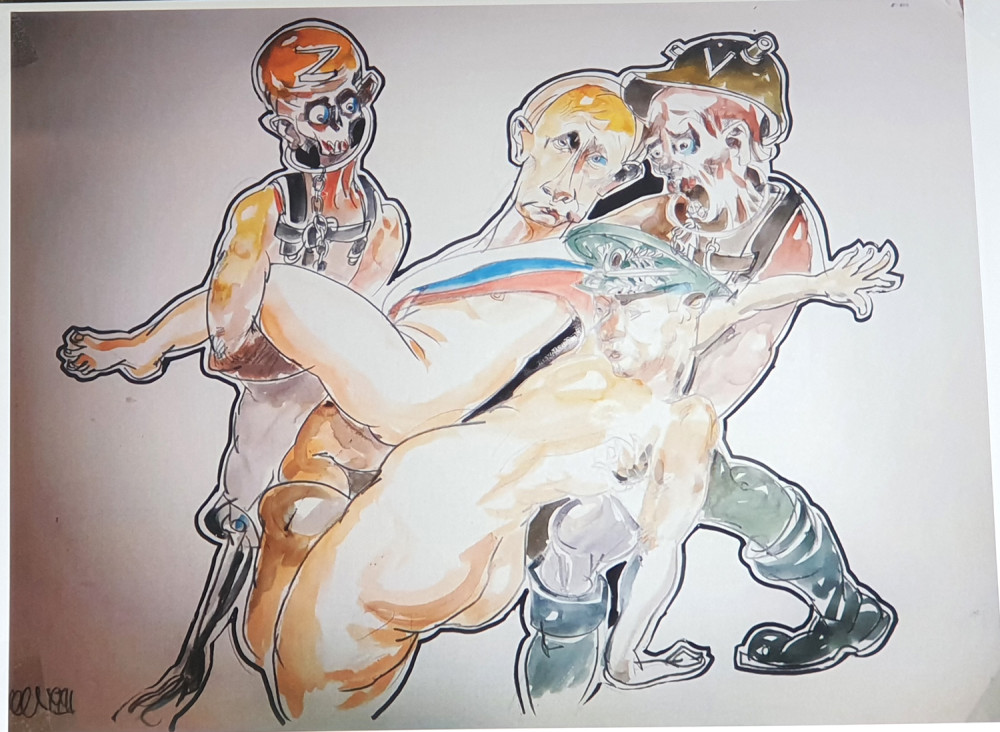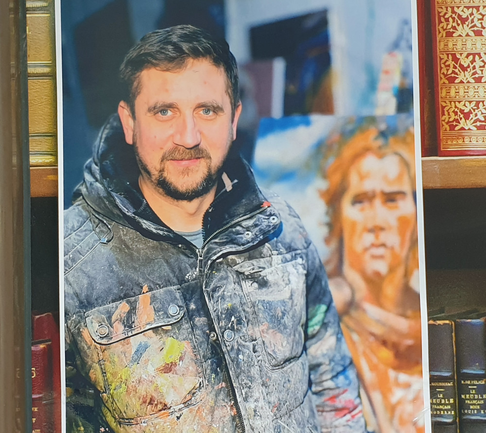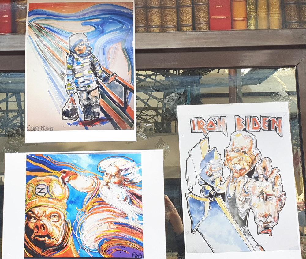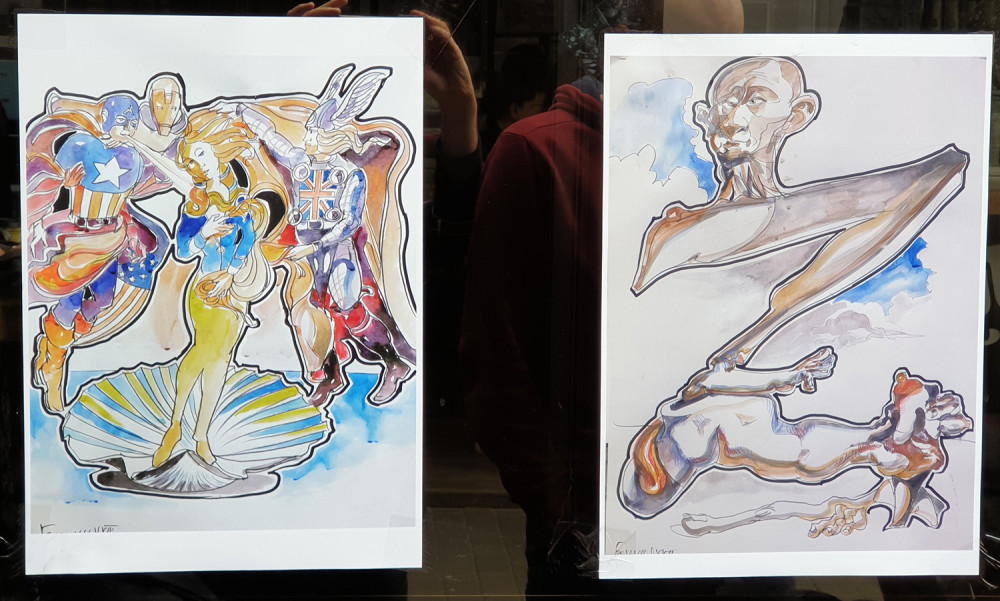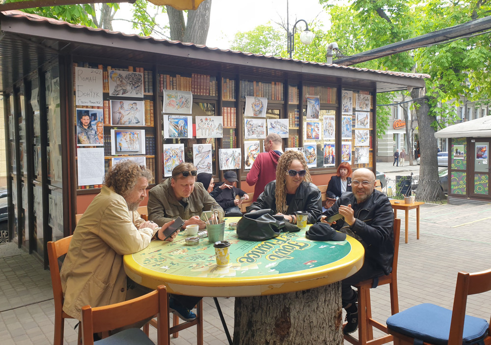 Новая выставка антивоенного украинского искусства на книжном рынке, что на Александровском бульваре, знакомит со свежими произведениями художника из Ивано-Франковска Романа Бончука, автора проекта первого в Украине музея Небесной сотни, а также гигантского полотна «Хроники Украины-Руси».