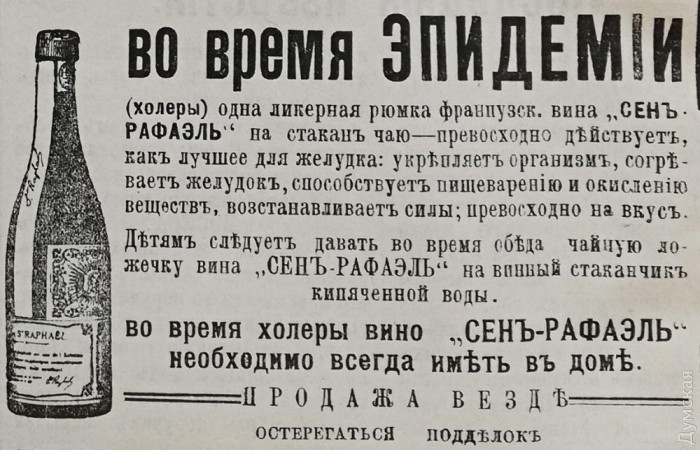 Тверезість як зброя. Карикатура часів Першої світової «Ваш кореспондент обійшов з десяток питних закладів і не знайшов у них нічого, крім квасу. Обличчя одеситів похмурі. Різдво перетворюється на якусь нудну виставу без родзинки», — обурюються «Маленькие одесские новости». «І все ж щось у цьому є. На вулицях не побачиш п'яної публіки, що пустує, немає бійок, ніхто не горланить пісень. Мабуть, це найспокійніше Різдво в історії», — заперечує колегам «Одесский листок». Напевно, у репортерів і редакторів видань були різні погляди на алкоголь. Проблеми з випивкою виникли в одеситів і під час зустрічі нового XX століття. Найсильніші снігопади у двадцятих числах грудня 1900 року фактично відрізали місто від зовнішнього світу. Через снігові замети зупинився рух поїздів, замерзло море, підскочили ціни на продукти, гас і свічки. До Одеси так і не потрапив вантаж шампанського! Нове століття наші прадіди вітали без шипучого напою, наповнюючи келихи звичайною горілкою ЧУМНІ Різного роду епідемії переслідували Одесу постійно. Всі ми пам'ятаємо «ковідні» 2020 та 2021-й. Під час Першої світової та революції населення косили холера і тиф. До того великою проблемою були захворювання, що передаються статевим шляхом, зокрема сифіліс.