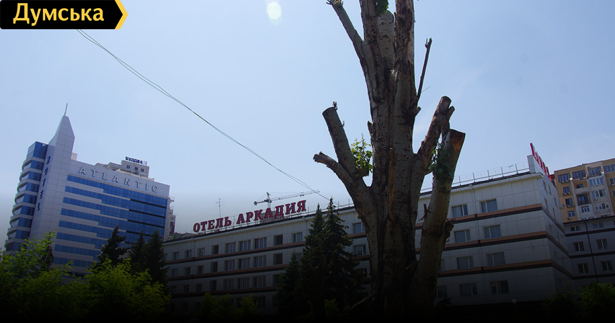 Напомним, заготовка дров в зеленой зоне у «Аркадии» продолжается с января 2013-го. Занимается ею администрация отеля, причем делает это весьма хитро. Вместо того, чтобы просто рубить деревья под корень сотрудники гостиницы регулярно осуществляют так называемое «кронирование» — срезают кроны. Только деревья отрастят новые ветки — тут же появляются мужики с бензопилами. Расчет тут на то, что подобную операцию способны пережить далеко не все растения. По нашим подсчетам, после первой обрезки в январе 2013-го погибло не менее пятнадцати деревьев, в результате второй, в декабре того же года, скончалось еще 10. Прошлой весной в сквере появилась летняя площадка ресторана и детский игровой комплекс. В этом году деревья пилили два раза — в январе и апреле.
