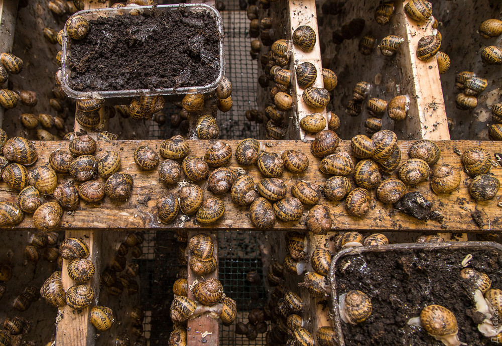 На отдельном столе выращивают Helix aspersa maxima, более крупного собрата muller. У этих улиток другой вкус и черная, как смоль, тушка. К слову, вопреки обывательскому мнению, улитки довольно проворны и, не будь по периметру стола специальных солевых барьеров, с удовольствием убежали бы на свободу.
