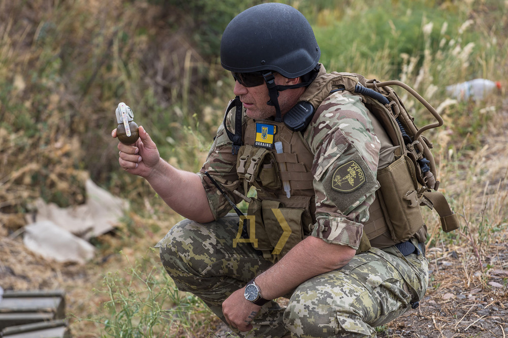Кроме сухих щелчков стрелкового оружия, на полигоне раздаются взрывы. Бойцы штурмового подразделения учатся уничтожать противника гранатами из окопа. Из оврага, где расположена условная цель для метания гранат, поднимаются клубы черного дыма и даже вылетают небольшие осколки.