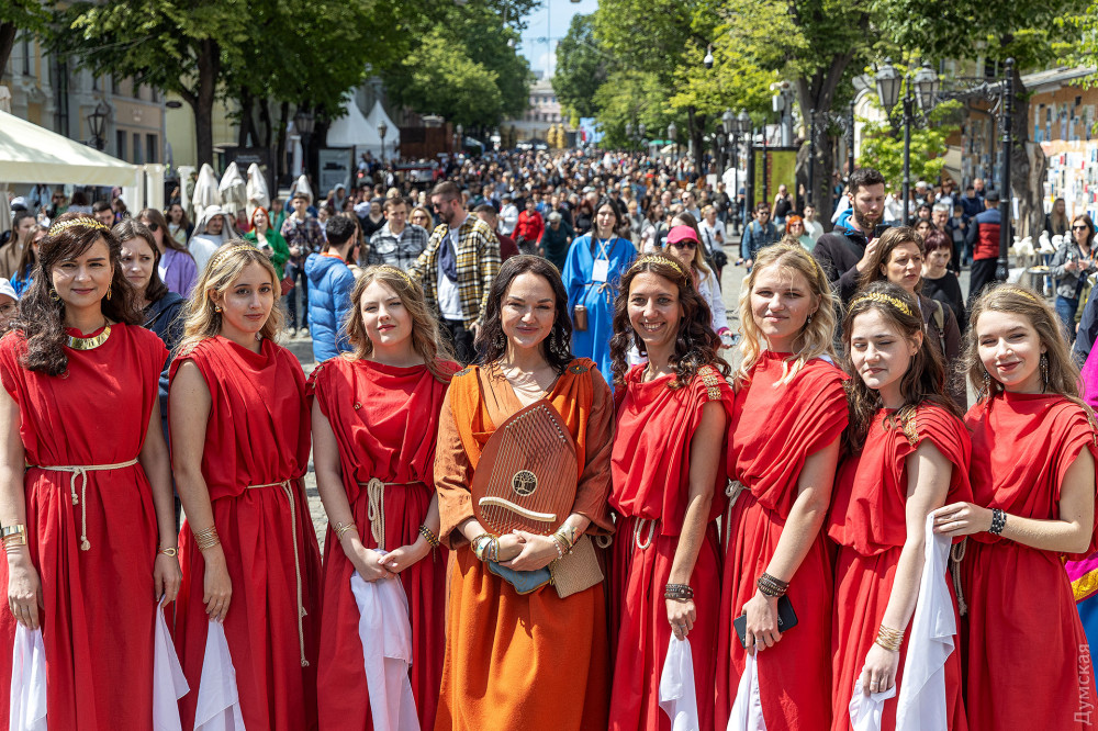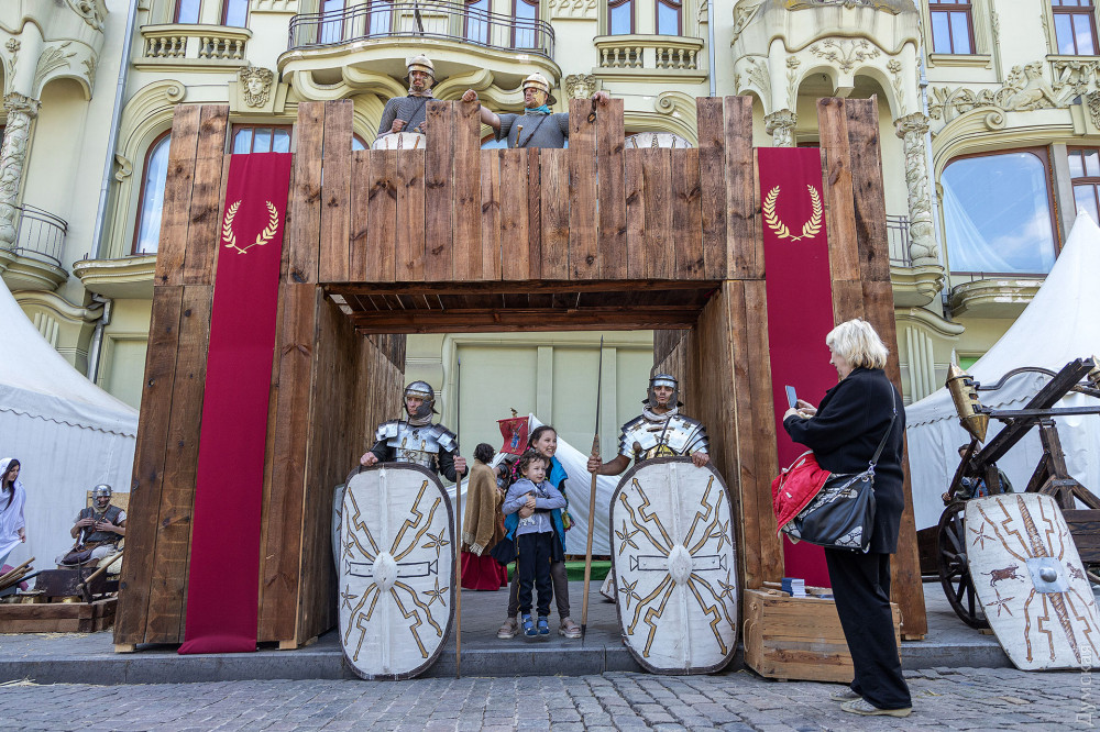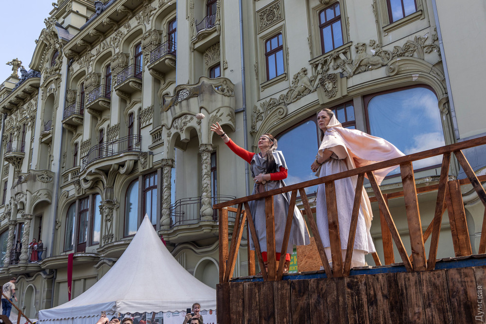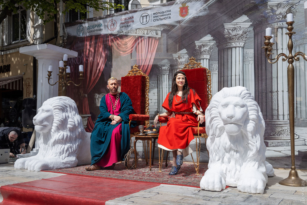 Вздовж Дерибасівської розмістили кілька масштабних інсталяцій: єрусалимський базар, палац Понтія Пилата, фортецю, зі стін якої розгніваний натовп кидав у Месію бутафорські фрукти.