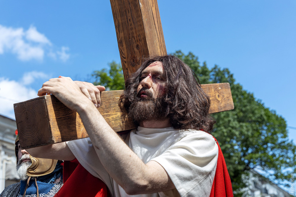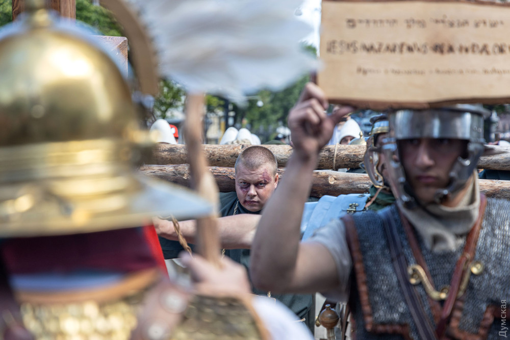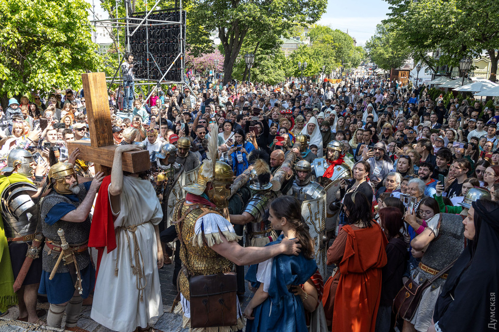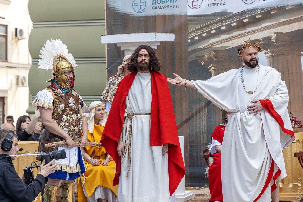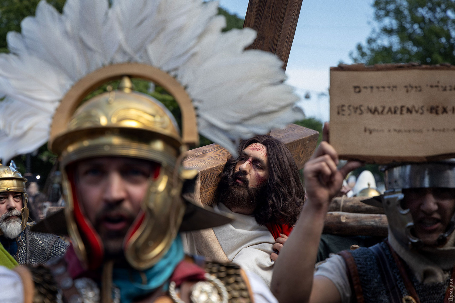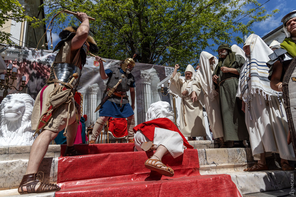 Минулого року барвиста костюмована вистава відбувалася здебільшого у сквері Гамова на Молдаванці — у центрі міста показали лише невелику сценку з Понтієм Пилатом.