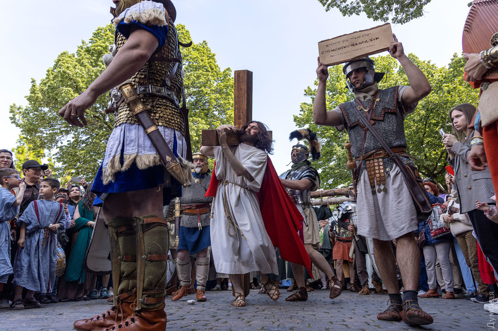 Костюмована вистава стартувала в районі ресторану McDonald's, де на ринку суворі легіонери затримали злочинця (або повстанця — тут тлумачення різняться) Варавву. Пізніше за намовлянням жерців до нього приєднався й Ісус із Назарету. Останній стійко витримав знущання натовпу і гідно проніс свій хрест, лише одного разу торкнувшись бруківки закривавленими колінами.