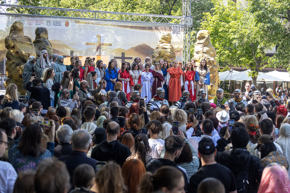 Кінцевою точкою процесії стала концертна сцена навпроти 12-го Стільця, яка символізувала Голгофу. Захід закінчився молитвою за мир в Україні, а декорації перетворилися на фотозони, де кожен охочий міг закарбувати себе з біблійним персонажем.