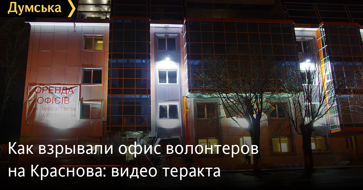 Мы получили запись с камер видеонаблюдения бизнес-центра «Адмиральский», где сегодня ночью прогремел взрыв. На ней видно, как неизвестная женщина оставляет взрывное устройство у входа в офис Волонтерской сотни и скрывается, после чего бомба срабатывает.