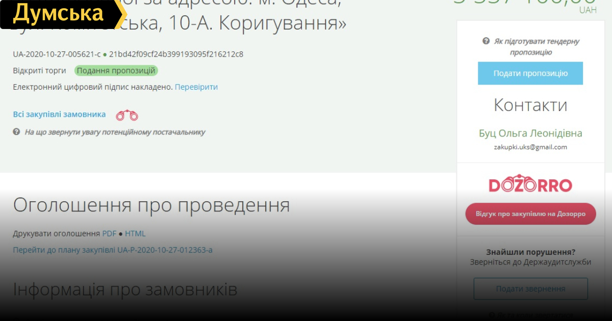 Управление капстроительства мэрии Одессы хочет потратить еще 5 млн на уже сделанный капремонтУправление капитального строительства Одесской мэрии сразу же после первого тура местных выборов объявило новый тендер (коригирование) на проведение капремонта своего здания, расположенного по адресу Комитетская улица, 10. Как передает корреспондент «Думской», аукцион начнется 17 ноября, предполагаемая стоимость работ составляет 5 млн 557 тысяч 100 гривен. В тендерной документации указаны условия — ремонт и реконструкция приемной, кабинетов, конференц-зала, санузла, коридора, душевой, кухни, входа, раздевалки, а также обустройство тротуара перед управлением и парковки, демонтаж старых пней и высадка одиннадцати новых деревьев. Сумма вроде как не космическая, но есть несколько серьезных «но»: во-первых, капитальный ремонт здания проводился совсем недавно — договор на сумму 11 млн 688 тысяч 800 гривен был подписан 21 июня 2017 года, а ремонт закончился в середине 2018 года. Выиграла торги известная нашим читателям компания «Экстерьер-Дизайн», которая совсем недавно проводила ремонт бульвара Жванецкого, но так и не закончила его до конца. Напомним, мэр Геннадий Турханов перед первым туром выборов торжественно открыл только часть бульвара, реконструкция которого обошлась городскому бюджету в 92 млн. гривен. Компания «Экстерьер-дизайн» была зарегистрирована в 2004 году. Директор — Валерий Возный, единственным учредителем является Анатолий Рагулин (однофамилец и тезка бывшего депутата горсовета от Партии регионов, который до 2013 года занимал должность начальника городского управления капстроительства). Фирма фигурирует в уголовном производстве, открытом по признакам ст. 364 УК Украины — «злоупотребление властью или служебным положением». Правоохранители установили, что служебные лица Южного ТерКЭУ признали «Экстерьер-дизайн» победителем тендера по реконструкции двух зданий на территории военного городка №238 (3-я Садовая улица в Суворовском районе Одессы) в общежитии, заключив с компанией два договора на общую сумму 35 млн грн. При этом предложение другого участника конкурса было дешевле на миллион грн. Выходит, летом 2017-го «Экстерьер-Дизайн» успешно начал капитальный ремонт здания управления капитального строительства, освоила почти 12 млн гривен, а спустя два года понадобился новый «капитальный ремонт» стоимостью 5,5 миллионов. Отметим, что в трехэтажном здании, которое принадлежит городской громаде, зарегистрировано, кроме самого управления и коммунального предприятия «Городское коммунальное строительство», еще с десяток частных фирм и компаний: ООО «Барс-Онт», ЧП «ФОТ», юрфирма «ДИАС» и ее различные филиалы и так далее. Корреспондент «Думской» побывала в этом тихом уголке Молдаванки — на засаженной развесистыми платанами Комитетской улице. Перед зданием управления, правда, деревьев нет. Асфальт тут в запущенном состоянии, припаркованные машины прямо на тротуаре. На первом этаже располагается похоронное бюро — стоят венки и гробы. В самом управлении охранник не пустил нас дальше холла — объяснил, что карантин и прессе нельзя. Сам рассказал, что недавно был ремонт во всех помещениях, указал на новые стены, плитку, потолки и мебель и очень удивился, что готовятся какие-то дополнительные работы. СМЕРТЬ РОСІЙСЬКИМ ОКУПАНТАМ! Помітили пом