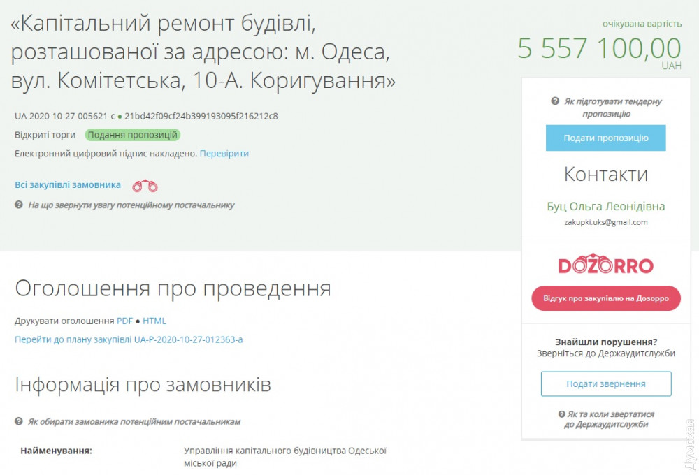 Управление капитального строительства Одесской мэрии сразу же после первого тура местных выборов объявило новый тендер (коригирование) на проведение капремонта своего здания, расположенного по адресу Комитетская улица, 10.