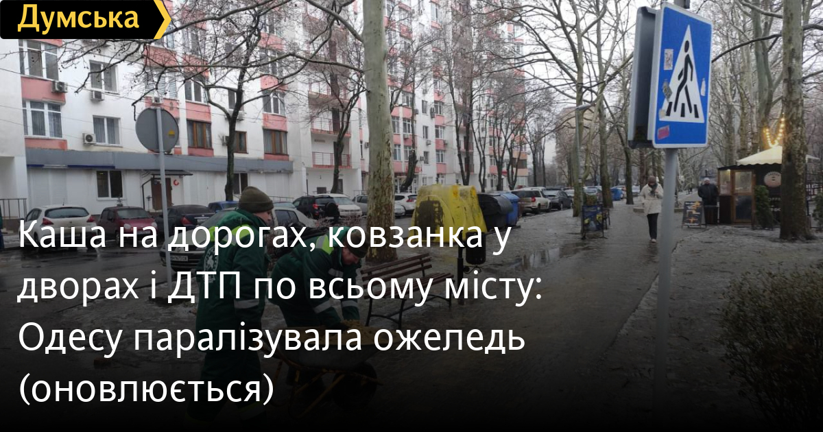 Каша на дорогах, ковзанка у дворах і ДТП по всьому місту: Одесу паралізувала ожеледь (оновлюється)Через нічний сніг з дощем і різке зниження температури вулиці Одеси перетворилися на справжню ковзанку, а проїжджа частина на «кашу». Пересуватися містом вкрай складно, а погана видимість і слизьке покриття вже призвели до численних аварій у різних районах, повідомляють кореспонденти «Думської». вул. Караванського (Жуковського) Французський бульвар / віцеадмірала Азарова Попри складну ситуацію, в мерії заявляють, що майже 1600 комунальників посипають піщано-сольовою сумішшю спуски, підйоми та основні магістралі. Станом на 9:00 використано вже 502 тонни суміші, на лінії працюють 49 одиниць спецтехніки. Реагентами також обробляють прибудинкові території та виходи з парадних, тротуари та пішохідні переходи, зупинки громадського транспорту, підходи до бюветів та громадських вбиралень. Водночас соцмережі переповнені повідомленнями про те, що більшість тротуарів і прибудинкових територій залишаються необробленими, а пішохідні зони перетворилися на зону підвищеного травматизму. У Гідрометцентрі Чорного та Азовського морів повідомляють про жовтий рівень небезпеки. Протягом доби 26 січня очікуються пориви вітру до 15-20 м/с, а ранковий туман обмежив видимість до критичних 200-500 метрів. Всіх учасників дорожнього руху закликають до максимальної обережності. Водіям варто вибирати безпечну швидкість, уникати різких маневрів і суворо дотримуватися дистанції. Маршрути краще планувати заздалегідь з урахуванням заторів і складності проїзду. Літнім людям, вагітним жінкам і дітям рекомендується максимально обмежити перебування на вулиці. ОНОВЛЕНО 13:05 За інформацією КП «Міськзелентрест» відомо про 9 випадків падіння дерев та великих гілок. СМЕРТЬ РОСІЙСЬКИМ ОКУПАНТАМ!