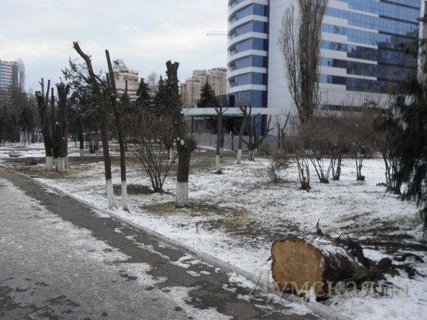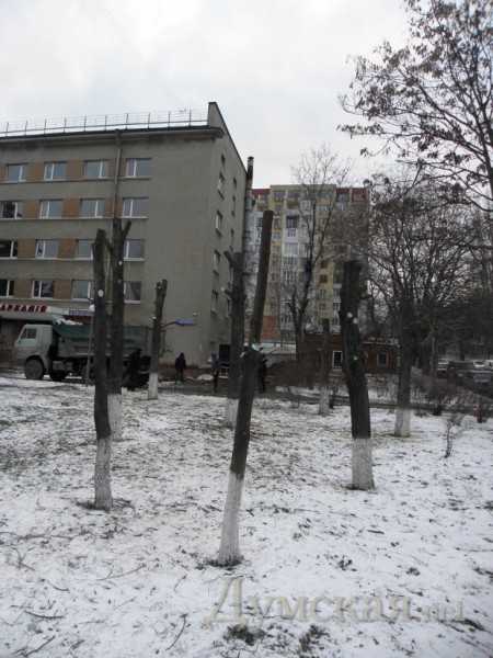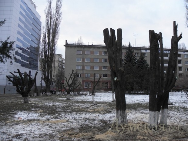 Целый сквер на улице Генуэзской, у гостиницы «Аркадия», в буквальном смысле слова был обезглавлен. Вчера и сегодня десятки прекрасных деревьев лишились под визг бензопил своих крон, превратившись в уныло торчащие из земли столбики 3-5-метровой высоты. А возле бывшего «Туриста» (сейчас это развлекательный комплекс «Zимний») часть деревьев и вовсе снесли.