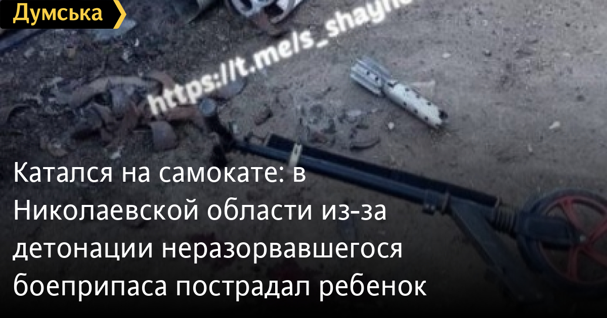 Катався на самокаті: у Миколаївській області через детонацію боєприпасу, що не розірвався, постраждала дитина9-річний хлопчик постраждав унаслідок детонації знайденого на городі боєприпасу, що не розірвався, у Миколаївській області. Про це повідомив голова головного управління Нацполіції в Миколаївській області Сергій Шайхет. За його словами, мешканець села Лимани, що під Миколаєвом, знайшов на своєму городі касетний снаряд, який не розірвався, приніс його і залишив на подвір'ї, а сам пішов у справах. У цей час у дворі на самокаті катався дев'ятирічний хлопчик. «Снаряд здетонував, дитина отримала осколкові поранення. Наразі хлопчика доправили до лікарні. За його життя борються медики», — зазначив він. Сергій Шайхет нагадав, що в тих районах, де велися активні бойові дії та які були під окупацією, дуже багато небезпечних знахідок, і закликав мешканців бути максимально обережними, не торкатися знайдених предметів, оскільки вони можуть бути смертельно небезпечними. СМЕРТЬ РОСІЙСЬКИМ ОКУПАНТАМ! Помітили помилку? Виділяйте слова з помилкою та натискайте control-enter |